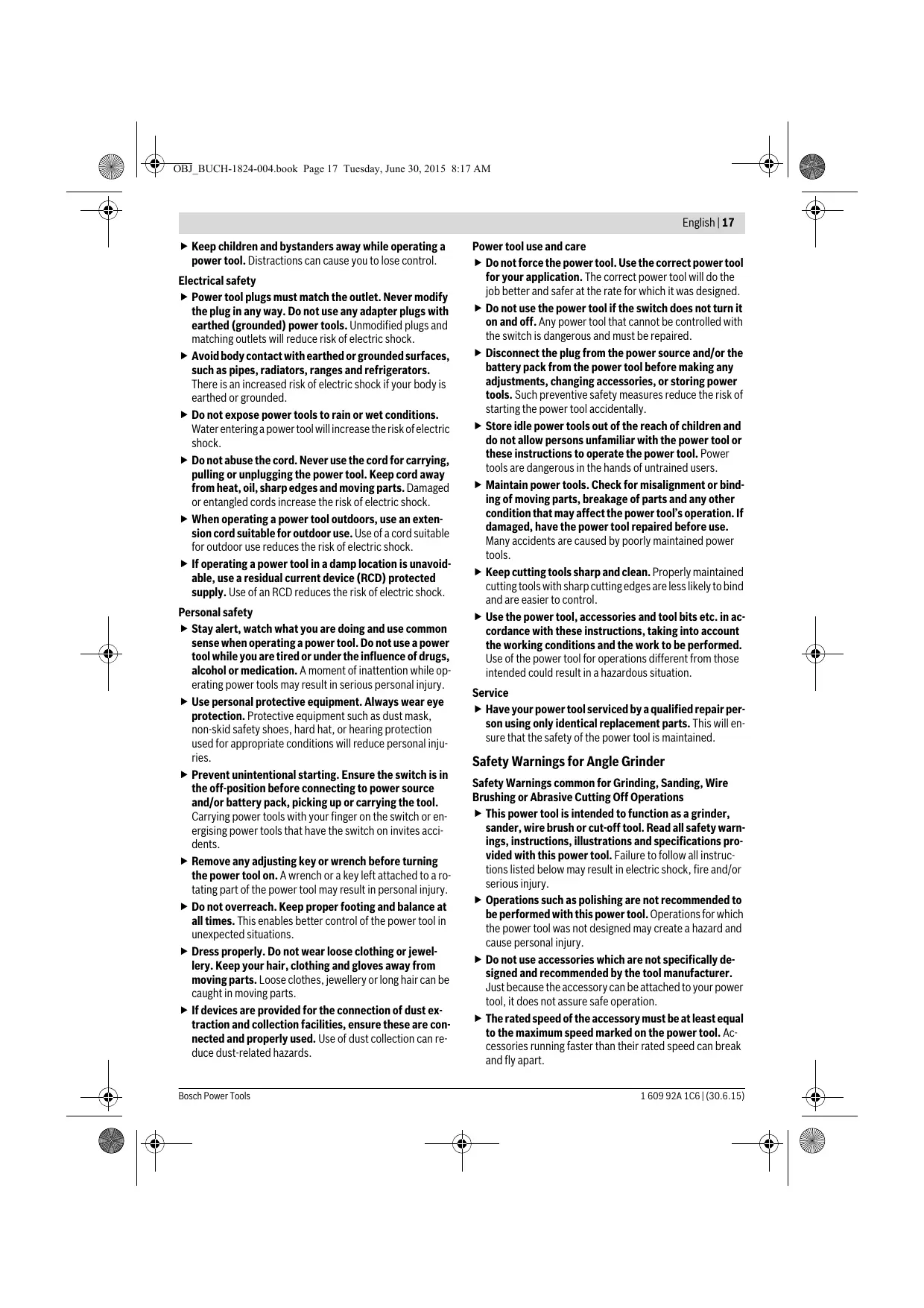 Bosch Power Tools OBJ_BUCH-1824-004.book Page 11 Tuesday, June 30, 2015 8:17 AM OBJ_BUCH-1824-004.book Page 12 Tuesday, June 30, 2015 8:17 AM Henk Becker Executive Vice President Engineering Helmut Heinzelmann Head of Product Certification PT/ETM9 Bosch Power Tools OBJ_BUCH-1824-004.book Page 13 Tuesday, June 30, 2015 8:17 AM Deutsch | 13 Bosch Power Tools OBJ_BUCH-1824-004.book Page 14 Tuesday, June 30, 2015 8:17 AM OBJ_BUCH-1824-004.book Page 15 Tuesday, June 30, 2015 8:17 AM Bosch Power Tools 1 609 92A 1C6 | (30.6.15) OBJ_BUCH-1824-004.book Page 16 Tuesday, June 30, 2015 8:17 AM 16 | English English Safety Notes General Power Tool Safety Warnings WARNING Read all safety warnings and all instructions. Failure to follow the warnings and instructions may result in electric shock, fire and/or serious injury. Save all warnings and instructions for future reference. The term “power tool” in the warnings refers to your mainsoperated (corded) power tool or battery-operated (cordless) power tool. Work area safety Keep work area clean and well lit. Cluttered or dark areas invite accidents. Do not operate power tools in explosive atmospheres, such as in the presence of flammable liquids, gases or dust. Power tools create sparks which may ignite the dust or fumes. Bosch Power Tools OBJ_BUCH-1824-004.book Page 17 Tuesday, June 30, 2015 8:17 AM English | 17 Keep children and bystanders away while operating a power tool. Distractions can cause you to lose control. Electrical safety Power tool plugs must match the outlet. Never modify the plug in any way. Do not use any adapter plugs with earthed (grounded) power tools. Unmodified plugs and matching outlets will reduce risk of electric shock. Avoid body contact with earthed or grounded surfaces, such as pipes, radiators, ranges and refrigerators. There is an increased risk of electric shock if your body is earthed or grounded. Do not expose power tools to rain or wet conditions. Water entering a power tool will increase the risk of electric shock. Do not abuse the cord. Never use the cord for carrying, pulling or unplugging the power tool. Keep cord away from heat, oil, sharp edges and moving parts. Damaged or entangled cords increase the risk of electric shock. When operating a power tool outdoors, use an extension cord suitable for outdoor use. Use of a cord suitable for outdoor use reduces the risk of electric shock. If operating a power tool in a damp location is unavoidable, use a residual current device (RCD) protected supply. Use of an RCD reduces the risk of electric shock. Personal safety Stay alert, watch what you are doing and use common sense when operating a power tool. Do not use a power tool while you are tired or under the influence of drugs, alcohol or medication. A moment of inattention while operating power tools may result in serious personal injury. Use personal protective equipment. Always wear eye protection. Protective equipment such as dust mask, non-skid safety shoes, hard hat, or hearing protection used for appropriate conditions will reduce personal injuries. Prevent unintentional starting. Ensure the switch is in the off-position before connecting to power source and/or battery pack, picking up or carrying the tool. Carrying power tools with your finger on the switch or energising power tools that have the switch on invites accidents. Remove any adjusting key or wrench before turning the power tool on. A wrench or a key left attached to a rotating part of the power tool may result in personal injury. Do not overreach. Keep proper footing and balance at all times. This enables better control of the power tool in unexpected situations. Dress properly. Do not wear loose clothing or jewellery. Keep your hair, clothing and gloves away from moving parts. Loose clothes, jewellery or long hair can be caught in moving parts. If devices are provided for the connection of dust extraction and collection facilities, ensure these are connected and properly used. Use of dust collection can reduce dust-related hazards. Bosch Power Tools Power tool use and care Do not force the power tool. Use the correct power tool for your application. The correct power tool will do the job better and safer at the rate for which it was designed. Do not use the power tool if the switch does not turn it on and off. Any power tool that cannot be controlled with the switch is dangerous and must be repaired. Disconnect the plug from the power source and/or the battery pack from the power tool before making any adjustments, changing accessories, or storing power tools. Such preventive safety measures reduce the risk of starting the power tool accidentally. Store idle power tools out of the reach of children and do not allow persons unfamiliar with the power tool or these instructions to operate the power tool. Power tools are dangerous in the hands of untrained users. Maintain power tools. Check for misalignment or binding of moving parts, breakage of parts and any other condition that may affect the power tool’s operation. If damaged, have the power tool repaired before use. Many accidents are caused by poorly maintained power tools. Keep cutting tools sharp and clean. Properly maintained cutting tools with sharp cutting edges are less likely to bind and are easier to control. Use the power tool, accessories and tool bits etc. in accordance with these instructions, taking into account the working conditions and the work to be performed. Use of the power tool for operations different from those intended could result in a hazardous situation. Service Have your power tool serviced by a qualified repair person using only identical replacement parts. This will ensure that the safety of the power tool is maintained. Safety Warnings for Angle Grinder Safety Warnings common for Grinding, Sanding, Wire Brushing or Abrasive Cutting Off Operations This power tool is intended to function as a grinder, sander, wire brush or cut-off tool. Read all safety warnings, i