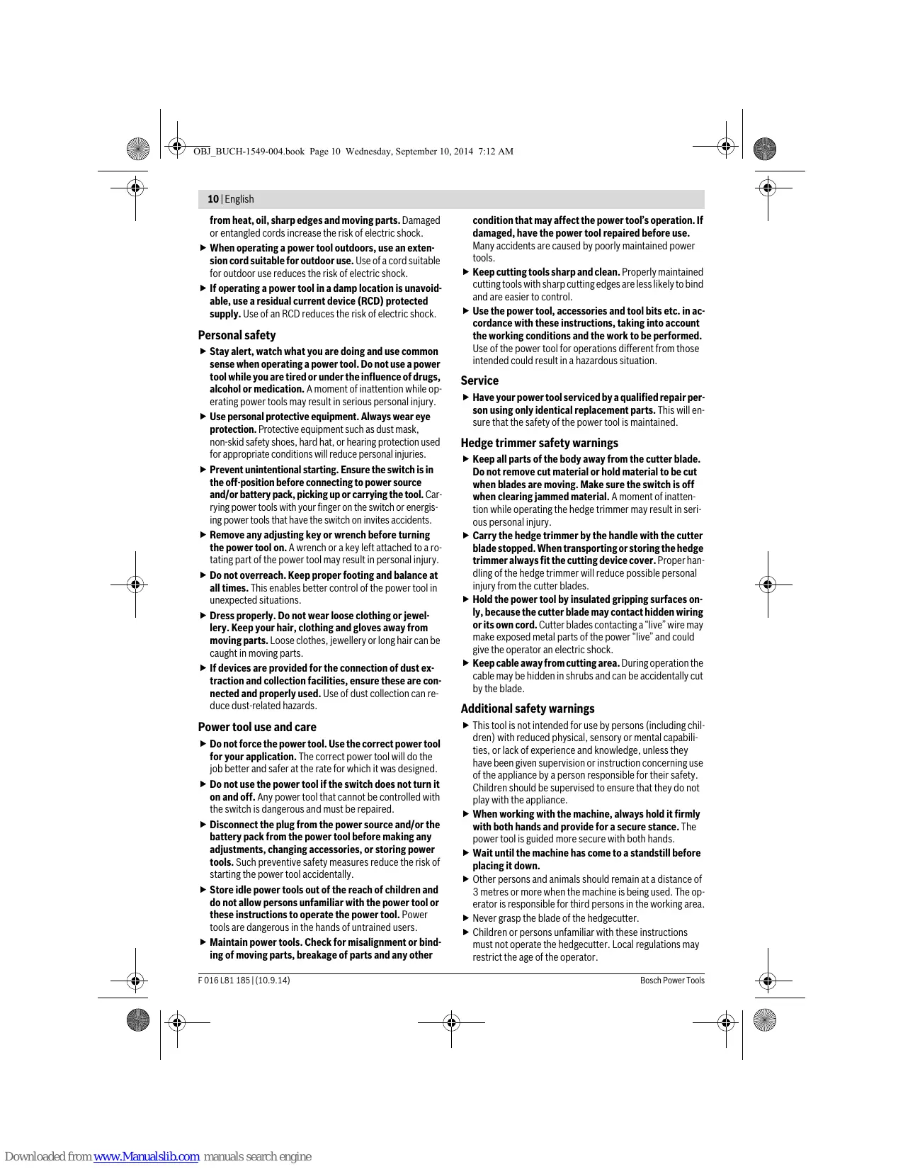 OBJ_BUCH-1549-004.book Page 8 Wednesday, September 10, 2014 7:12 AM 8 | Deutsch Produktkategorie: 25 Technische Unterlagen (2006/42/EG, 2000/14/EG) bei: Bosch Lawn and Garden Ltd., PT-LG/ENS23, Stowmarket, Suffolk IP14 1EY, England Henk Becker Helmut Heinzelmann Executive Vice President Head of Product Certification Engineering PT/ETM9 Downloaded from www.Manualslib.com manuals search engine Bosch Power Tools OBJ_BUCH-1549-004.book Page 9 Wednesday, September 10, 2014 7:12 AM English | 9 Bosch Power Tools Downloaded from www.Manualslib.com manuals search engine English Safety Notes Explanation of symbols Read instruction manual. Do not use the hedgecutter in the rain or leave it outdoors when it is raining. Switch off and remove plug from mains before adjusting, cleaning or if the cable is entangled or if the cable is cut or damaged and before leaving the hedgecutter unattended for any period. Always wear ear protection. General Power Tool Safety Warnings Read all safety warnings and all instructions. Failure to follow the warnings and instructions may result in electric shock, fire and/or serious injury. Save all warnings and instructions for future reference. The term “power tool” in the warnings refers to your mainsoperated (corded) power tool or battery-operated (cordless) power tool. WARNING Work area safety Keep work area clean and well lit. Cluttered or dark areas invite accidents. Do not operate power tools in explosive atmospheres, such as in the presence of flammable liquids, gases or dust. Power tools create sparks which may ignite the dust or fumes. Keep children and bystanders away while operating a power tool. Distractions can cause you to lose control. Electrical safety Power tool plugs must match the outlet. Never modify the plug in any way. Do not use any adapter plugs with earthed (grounded) power tools. Unmodified plugs and matching outlets will reduce risk of electric shock. Avoid body contact with earthed or grounded surfaces, such as pipes, radiators, ranges and refrigerators. There is an increased risk of electric shock if your body is earthed or grounded. Do not expose power tools to rain or wet conditions. Water entering a power tool will increase the risk of electric shock. Do not abuse the cord. Never use the cord for carrying, pulling or unplugging the power tool. Keep cord away F 016 L81 185 | (10.9.14) OBJ_BUCH-1549-004.book Page 10 Wednesday, September 10, 2014 7:12 AM 10 | English from heat, oil, sharp edges and moving parts. Damaged or entangled cords increase the risk of electric shock. When operating a power tool outdoors, use an extension cord suitable for outdoor use. Use of a cord suitable for outdoor use reduces the risk of electric shock. If operating a power tool in a damp location is unavoidable, use a residual current device (RCD) protected supply. Use of an RCD reduces the risk of electric shock. Personal safety Stay alert, watch what you are doing and use common sense when operating a power tool. Do not use a power tool while you are tired or under the influence of drugs, alcohol or medication. A moment of inattention while operating power tools may result in serious personal injury. Use personal protective equipment. Always wear eye protection. Protective equipment such as dust mask, non-skid safety shoes, hard hat, or hearing protection used for appropriate conditions will reduce personal injuries. Prevent unintentional starting. Ensure the switch is in the off-position before connecting to power source and/or battery pack, picking up or carrying the tool. Carrying power tools with your finger on the switch or energising power tools that have the switch on invites accidents. Remove any adjusting key or wrench before turning the power tool on. A wrench or a key left attached to a rotating part of the power tool may result in personal injury. Do not overreach. Keep proper footing and balance at all times. This enables better control of the power tool in unexpected situations. Dress properly. Do not wear loose clothing or jewellery. Keep your hair, clothing and gloves away from moving parts. Loose clothes, jewellery or long hair can be caught in moving parts. If devices are provided for the connection of dust extraction and collection facilities, ensure these are connected and properly used. Use of dust collection can reduce dust-related hazards. Power tool use and care Do not force the power tool. Use the correct power tool for your application. The correct power tool will do the job better and safer at the rate for which it was designed. Do not use the power tool if the switch does not turn it on and off. Any power tool that cannot be controlled with the switch is dangerous and must be repaired. Disconnect the plug from the power source and/or the battery pack from the power tool before making any adjustments, changing accessories, or storing power tools. Such preventive safety measures reduce the risk of starting the power tool accidentally. Store idle power tools out of the reach of children and do not allow persons unfamiliar with the power tool or these instructions to operate the power tool. Power tools are dangerous in the hands of untrained users. Maintain power tools. Check for misalignment or binding of moving parts, breakage of parts and any other F 016 L81 185 | (10.9.14) Downloaded from www.Manualslib.com manuals search engine condition that may affect the power tool’s operation. If damaged, have the power tool repaired before use. Many accidents are caused by poorly maintained power tools. Keep cutting tools sharp and clean. Properly maintained cutting tools with sharp cutting edges are less likely to bind and are easier to control. Use the power tool, accessories and tool bits etc. in accordance with these instructions, taking into account the working conditions and the work to be performed. Use of the power tool for operations different from those intended could result in a hazardous situation. Service Have your power too