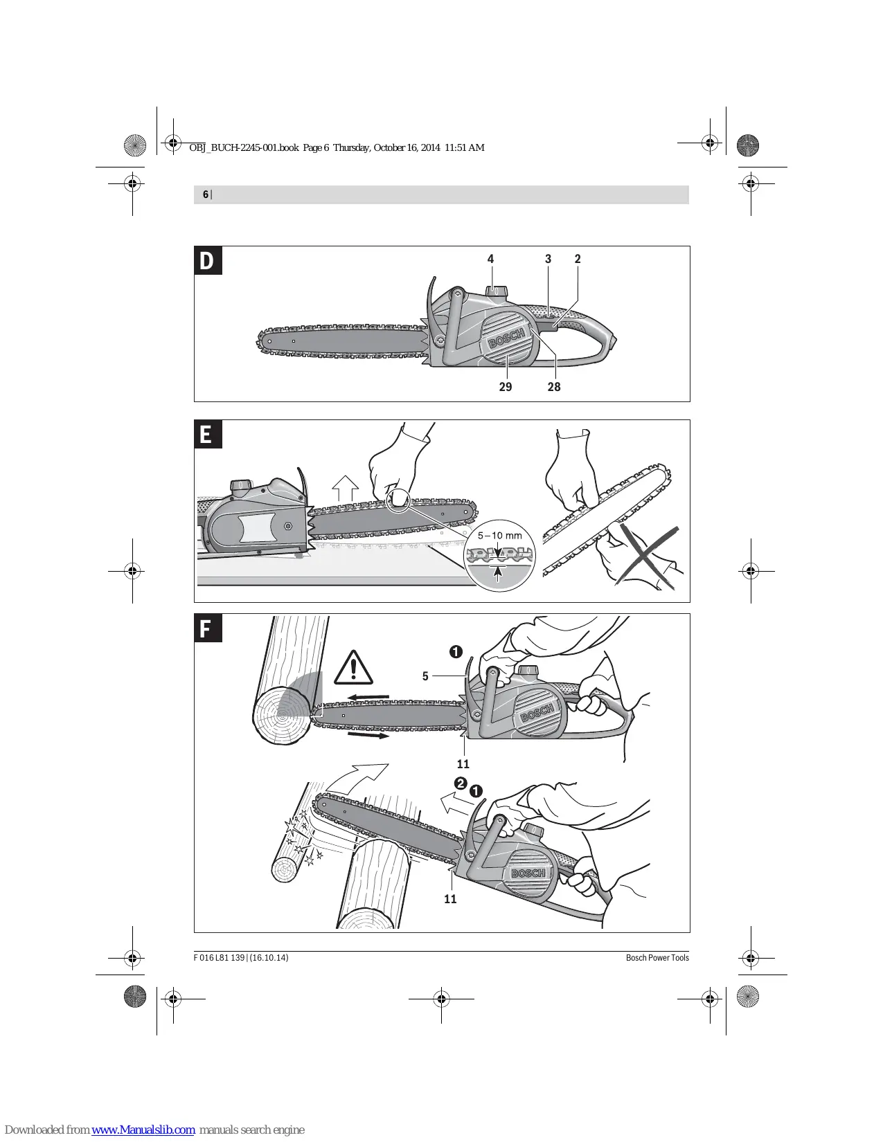 Always check the chain tension before use, after the first cuts and regularly during use approx. every 10 minutes. Upon initial operation, new chains can lengthen considerably. The chain life of the saw chain mainly depends upon sufficient lubrication and correct tensioning. Avoid tensioning the chain if it is hot, as this will cause the chain to become overtensioned and face too tightly against the chain bar when it cools down. – Place the chain saw on any suitable flat surface. – Check if the chain links are correctly located in the slot around the chain bar 10 and on the drive sprocket 20. – Loosen locking knob 12 until it is just holding chain bar in position (do not remove!). – Turn tensioning knob 14 clockwise until the correct chain tension is reached. The turning action forces the chain bar 10 forward via the chain tensioning peg 25. – The saw chain 9 is correctly tensioned when it can be raised approx. 5–10 mm from the chain bar in the centre. F 016 L81 139 | (16.10.14)