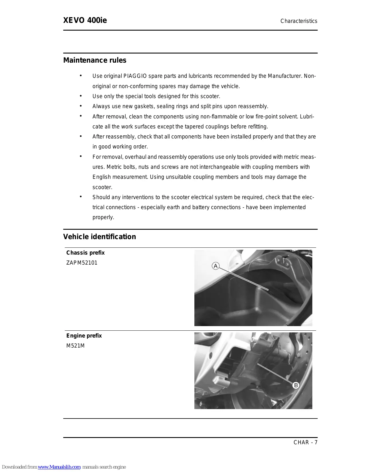 Should any interventions to the scooter electrical system be required, check that the electrical connections - especially earth and battery connections - have been implemented properly. Vehicle identification Chassis prefix ZAPM52101 Engine prefix M521M CHAR - 7 Downloaded from www.Manualslib.com manuals search engine XEVO 400ie Characteristics Dimensions and mass