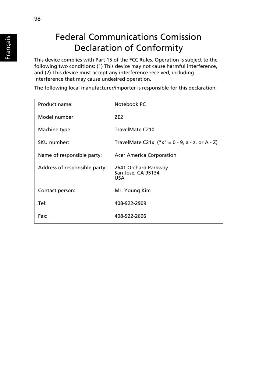 | Address of responsible party: | 2641 Orchard Parkway San Jose, CA 95134 USA |