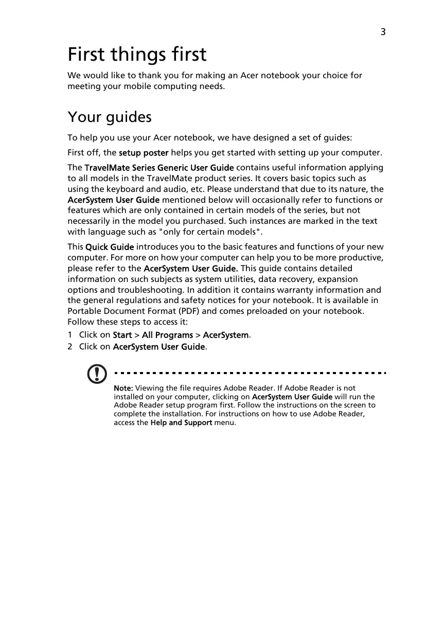 This Quick Guide introduces you to the basic features and functions of your new computer. For more on how your computer can help you to be more productive, please refer to the AcerSystem User Guide. This guide contains detailed information on such subjects as system utilities, data recovery, expansion options and troubleshooting. In addition it contains warranty information and the general regulations and safety notices for your notebook. It is available in Portable Document Format (PDF) and comes preloaded on your notebook. Follow these steps to access it: