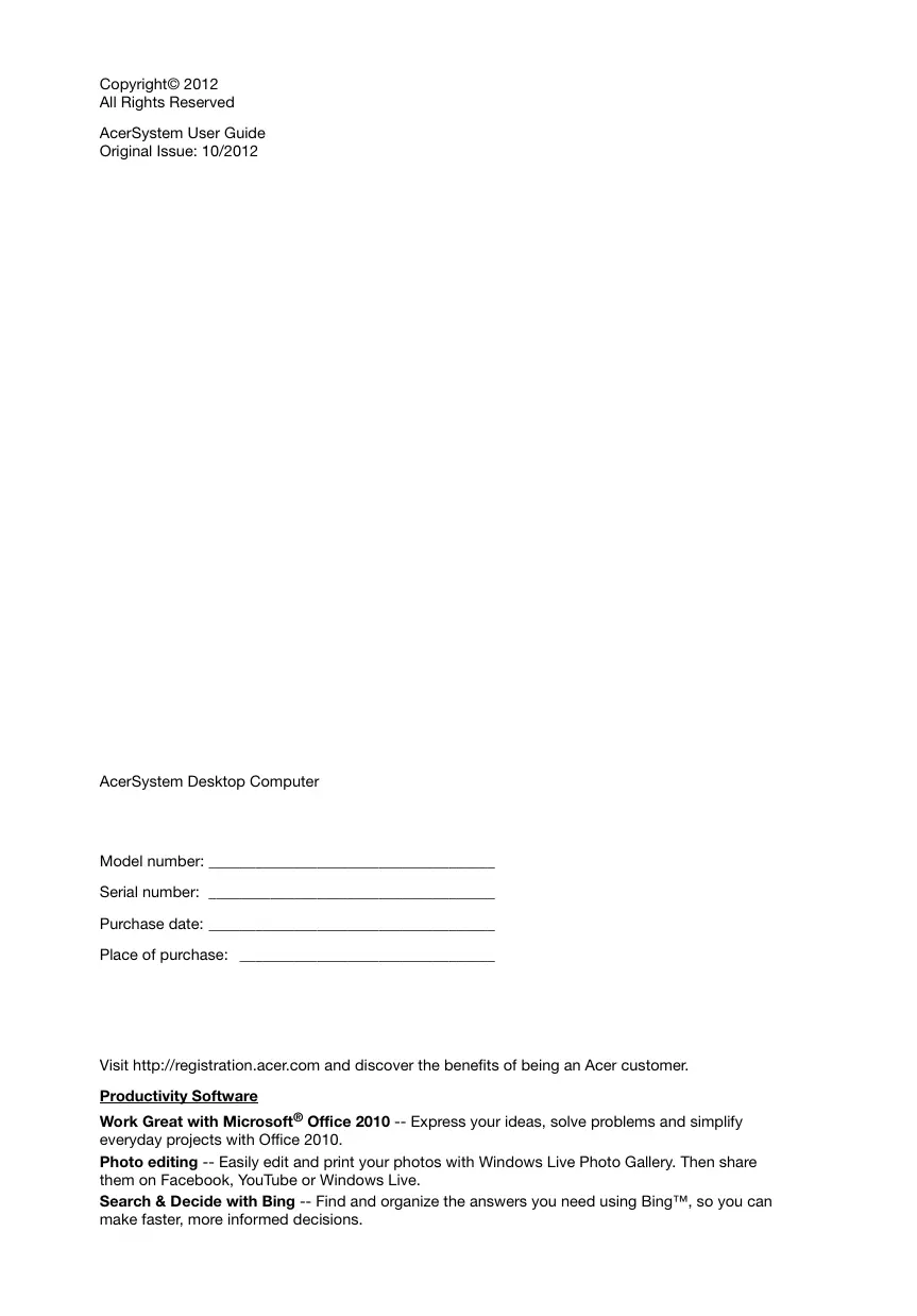 Copyright© 2012 All Rights Reserved AcerSystem User Guide Original Issue: 10/2012