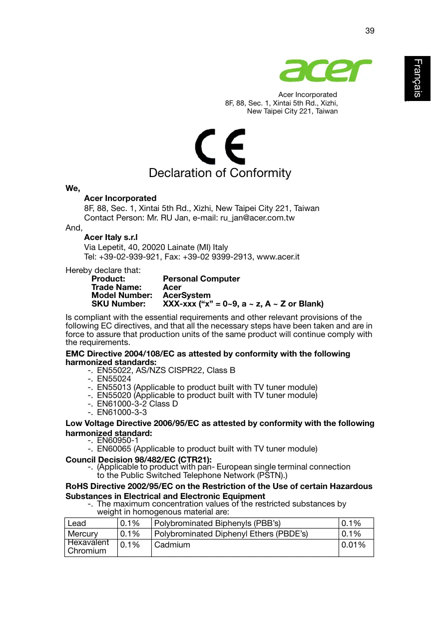 Acer Incorporated 8F, 88, Sec. 1, Xintai 5th Rd., Xizhi, New Taipei City 221, Taiwan Contact Person: Mr. RU Jan, e-mail: ru_jan@acer.com.tw And, Acer Italy s.r.l Via Lepetit, 40, 20020 Lainate (MI) Italy Tel: +39-02-939-921, Fax: +39-02 9399-2913, www.acer.it Hereby declare that: Product: Trade Name: Model Number: SKU Number: Personal Computer Acer AcerSystem XXX-xxx (“x” = 0~9, a ~ z, A ~ Z or Blank) Is compliant with the essential requirements and other relevant provisions of the following EC directives, and that all the necessary steps have been taken and are in force to assure that production units of the same product will continue comply with the requirements. EMC Directive 2004/108/EC as attested by conformity with the following harmonized standards: -. EN55022, AS/NZS CISPR22, Class B -. EN55024 -. EN55013 (Applicable to product built with TV tuner module) -. EN55020 (Applicable to product built with TV tuner module) -. EN61000-3-2 Class D -. EN61000-3-3 Low Voltage Directive 2006/95/EC as attested by conformity with the following harmonized standard: -. EN60950-1 -. EN60065 (Applicable to product built with TV tuner module) Council Decision 98/482/EC (CTR21): -. (Applicable to product with pan- European single terminal connection to the Public Switched Telephone Network (PSTN).) RoHS Directive 2002/95/EC on the Restriction of the Use of certain Hazardous Substances in Electrical and Electronic Equipment -. The maximum concentration values of the restricted substances by weight in homogenous material are: Lead 0.1% Polybrominated Biphenyls (PBB’s) 0.1% Mercury 0.1% Polybrominated Diphenyl Ethers (PBDE’s) 0.1% Hexavalent 0.1% Cadmium 0.01% Chromium Français Declaration of Conformity We, Français Acer Incorporated 8F, 88, Sec. 1, Xintai 5th Rd., Xizhi, New Taipei City 221, Taiwan Français
