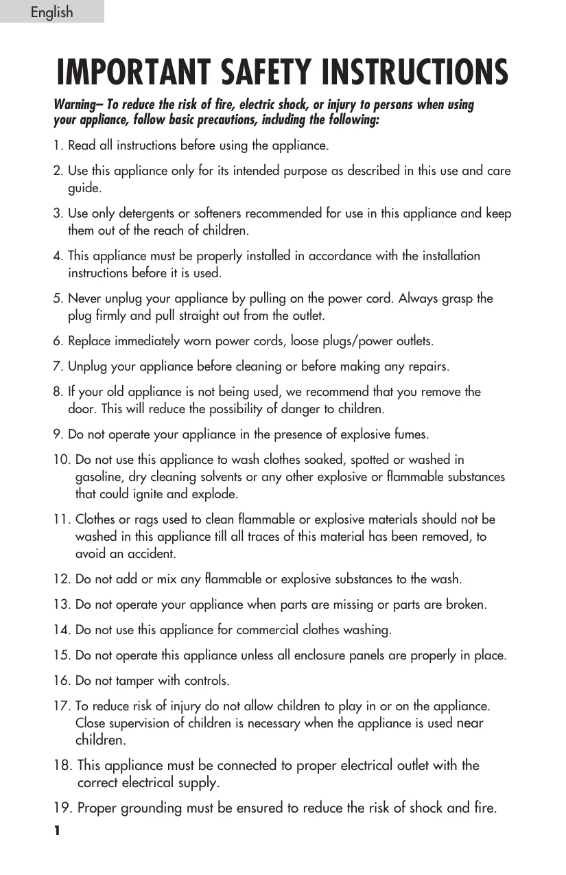 o not use this appliance to wash clothes soaked, spotted or washed in gasoline, dry cleaning solvents or any other explosive or flammable substances that could ignite and explode.