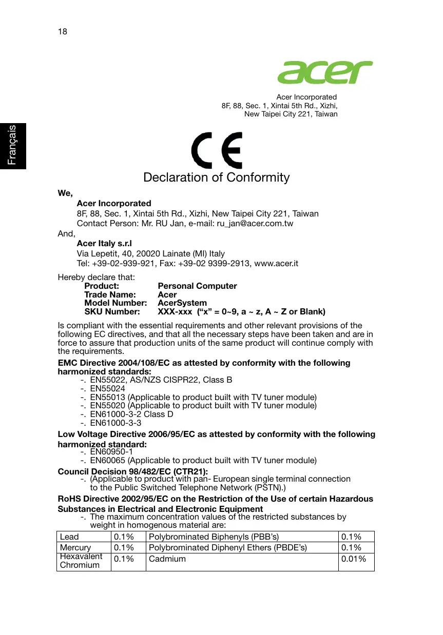 Français Acer Incorporated 8F, 88, Sec. 1, Xintai 5th Rd., Xizhi, New Taipei City 221, Taiwan Declaration of Conformity We, Acer Incorporated 8F, 88, Sec. 1, Xintai 5th Rd., Xizhi, New Taipei City 221, Taiwan Contact Person: Mr. RU Jan, e-mail: ru_jan@acer.com.tw And, Acer Italy s.r.l Via Lepetit, 40, 20020 Lainate (MI) Italy Tel: +39-02-939-921, Fax: +39-02 9399-2913, www.acer.it Hereby declare that: Product: Trade Name: Model Number: SKU Number: Personal Computer Acer AcerSystem XXX-xxx (“x” = 0~9, a ~ z, A ~ Z or Blank) Is compliant with the essential requirements and other relevant provisions of the following EC directives, and that all the necessary steps have been taken and are in force to assure that production units of the same product will continue comply with the requirements. EMC Directive 2004/108/EC as attested by conformity with the following harmonized standards: -. EN55022, AS/NZS CISPR22, Class B -. EN55024 -. EN55013 (Applicable to product built with TV tuner module) -. EN55020 (Applicable to product built with TV tuner module) -. EN61000-3-2 Class D -. EN61000-3-3 Low Voltage Directive 2006/95/EC as attested by conformity with the following harmonized standard: -. EN60950-1 -. EN60065 (Applicable to product built with TV tuner module) Council Decision 98/482/EC (CTR21): -. (Applicable to product with pan- European single terminal connection to the Public Switched Telephone Network (PSTN).) RoHS Directive 2002/95/EC on the Restriction of the Use of certain Hazardous Substances in Electrical and Electronic Equipment -. The maximum concentration values of the restricted substances by weight in homogenous material are: Lead 0.1% Polybrominated Biphenyls (PBB’s) 0.1% Mercury 0.1% Polybrominated Diphenyl Ethers (PBDE’s) 0.1% Hexavalent 0.1% Cadmium 0.01% Chromium