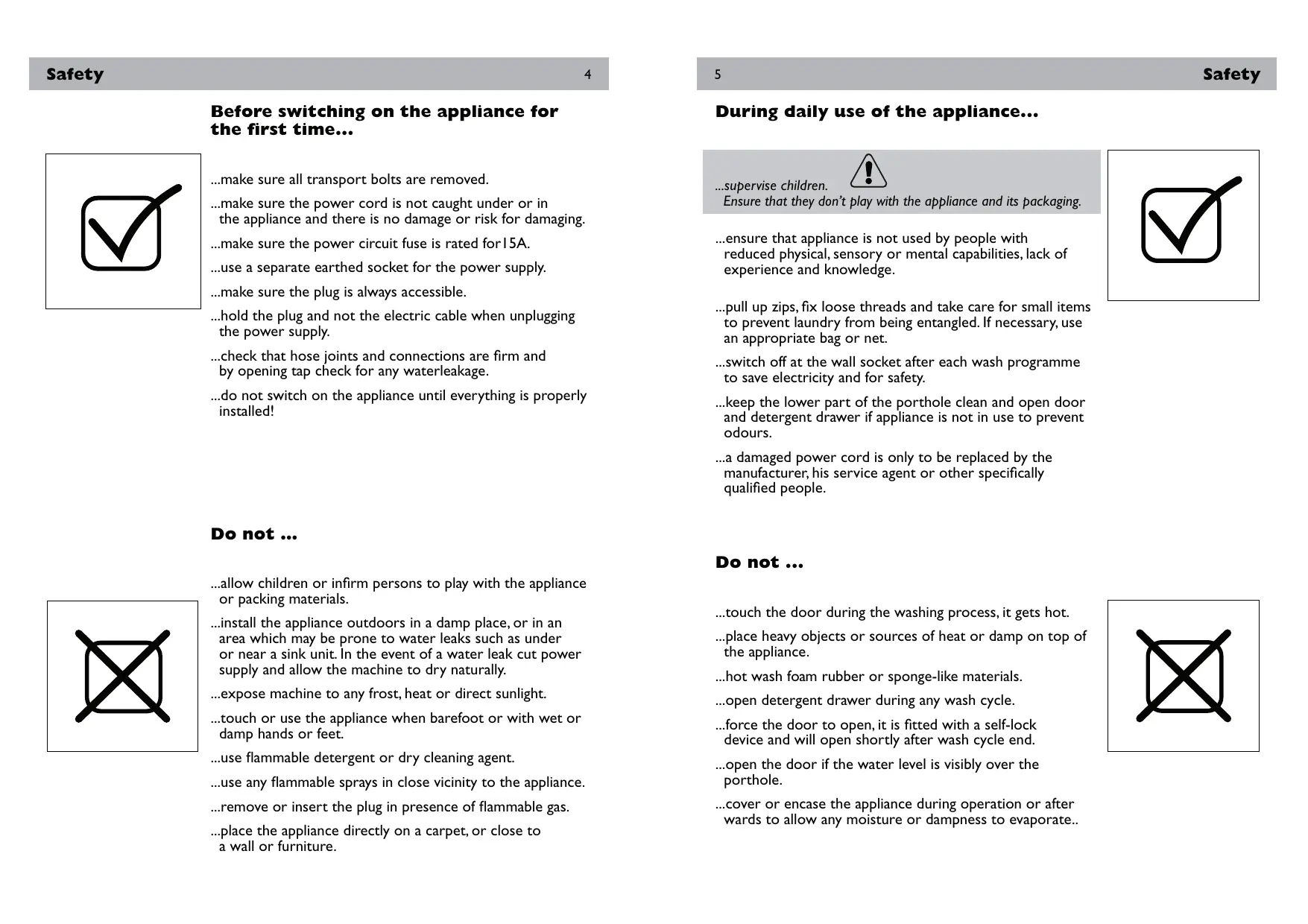 The presence of this symbol on the product, accessories or materials that goes with this information indicates that at the end of its useful life the product or its electronic accessories (e.g. cable, Aqua Stop hose) should not be disposed with other household waste. To prevent possible damage to the environment or human health from uncontrolled waste disposal, please separate these items from other types of waste and recycle them. This will promote the sustainable reuse of material resources. Household users should contact either the retailer where they purchased the product or relevant local authorities to find out how they can take this item for environmentally safe recycling and safety. Business users should contact their supplier and check the conditions of the purchase. This product and its electronic accessories should not be mixed with other commercial waste. Before switching on the appliance for the first time... During daily use of the appliance... ...make sure all transport bolts are removed. ...supervise children. Ensure that they don’t play with the appliance and its packaging. ...make sure the power cord is not caught under or in the appliance and there is no damage or risk for damaging. ...make sure the power circuit fuse is rated for15A. ...use a separate earthed socket for the power supply. ...ensure that appliance is not used by people with reduced physical, sensory or mental capabilities, lack of experience and knowledge. ...make sure the plug is always accessible. ...hold the plug and not the electric cable when unplugging the power supply. ...pull up zips, fix loose threads and take care for small items to prevent laundry from being entangled. If necessary, use an appropriate bag or net. ...check that hose joints and connections are firm and by opening tap check for any waterleakage. ...switch off at the wall socket after each wash programme to save electricity and for safety. ...do not switch on the appliance until everything is properly installed! ...keep the lower part of the porthole clean and open door and detergent drawer if appliance is not in use to prevent odours. ...a damaged power cord is only to be replaced by the manufacturer, his service agent or other specifically qualified people. Do not … Do not ... ...allow children or infirm persons to play with the appliance or packing materials. ...install the appliance outdoors in a damp place, or in an area which may be prone to water leaks such as under or near a sink unit. In the event of a water leak cut power supply and allow the machine to dry naturally. ...touch the door during the washing process, it gets hot. ...place heavy objects or sources of heat or damp on top of the appliance. ...hot wash foam rubber or sponge-like materials. ...expose machine to any frost, heat or direct sunlight. ...open detergent drawer during any wash cycle. ...touch or use the appliance when barefoot or with wet or damp hands or feet. ...force the door to open, it is fitted with a self-lock device and will open shortly after wash cycle end. ...use flammable detergent or dry cleaning agent. ...open the door if the water level is visibly over the porthole. ...use any flammable sprays in close vicinity to the appliance. ...remove or insert the plug in presence of flammable gas. ...place the appliance directly on a carpet, or close to a wall or furniture. ...cover or encase the appliance during operation or after wards to allow any moisture or dampness to evaporate.. Safety Product description