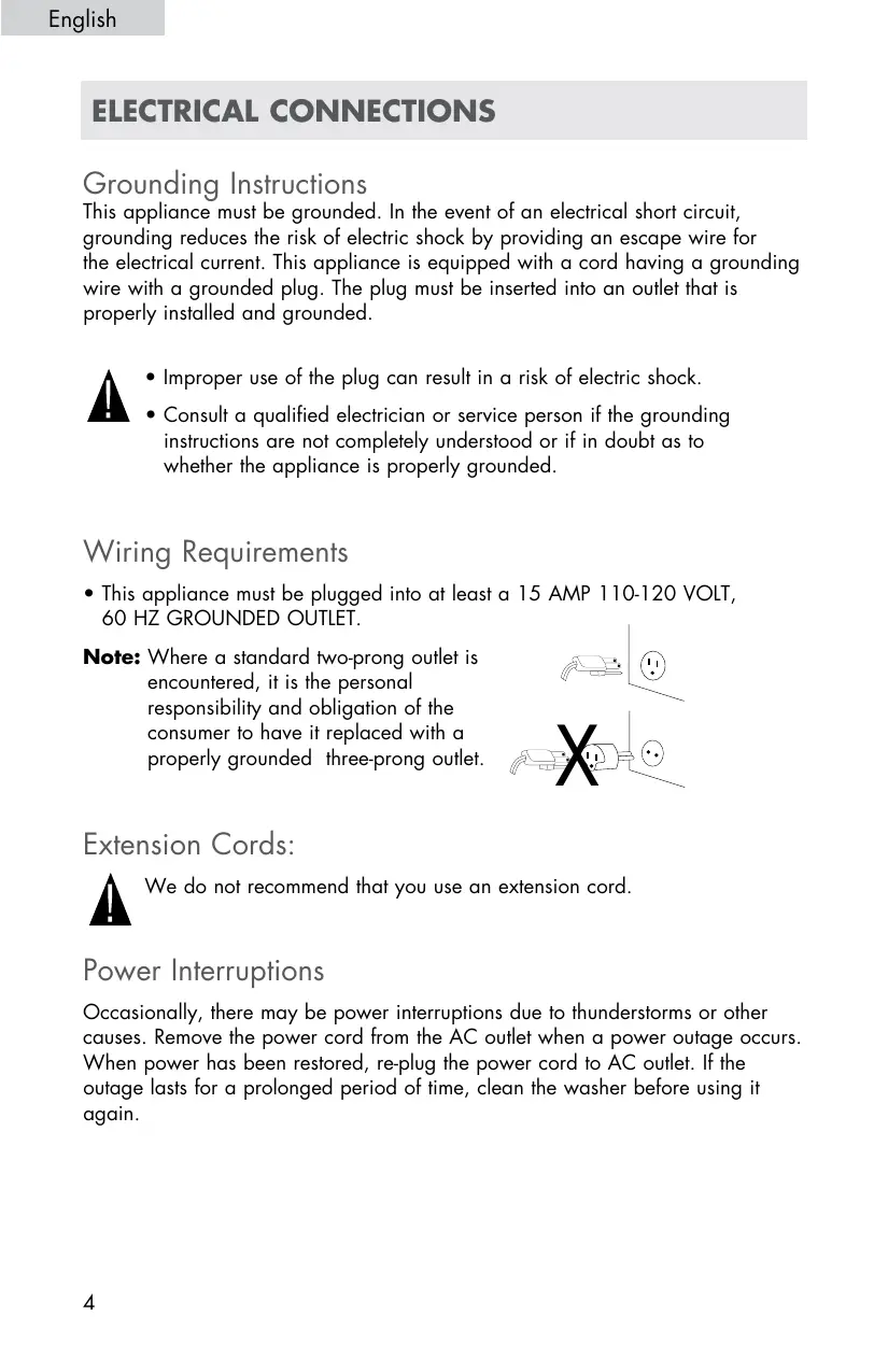 English ELECTRICAL CONNECTIONS Grounding Instructions This appliance must be grounded. In the event of an electrical short circuit, grounding reduces the risk of electric shock by providing an escape wire for the electrical current. This appliance is equipped with a cord having a grounding wire with a grounded plug. The plug must be inserted into an outlet that is properly installed and grounded.