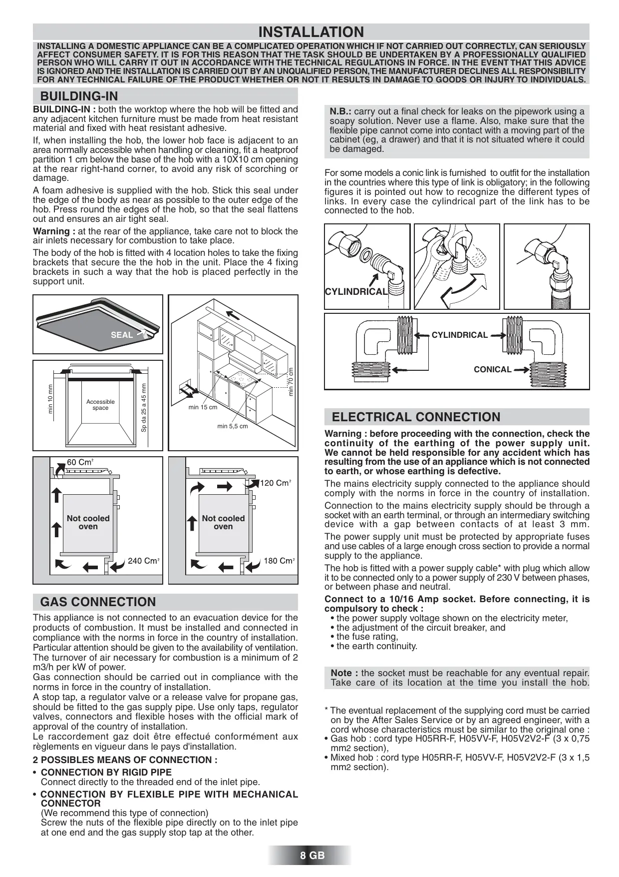 - The eventual replacement of the supplying cord must be carried on by the After Sales Service or by an agreed engineer, with a cord whose characteristics must be similar to the original one : + Gas hob : cord type HO5RR-F, HO5VV-F, HO5V2V2-F (3 x 0,75 mme section), + Mixed hob : cord type HO5RR-F, HOSVV-F, HO5V2V2-F (3 x 1,5 mm2 section). 8 GB: