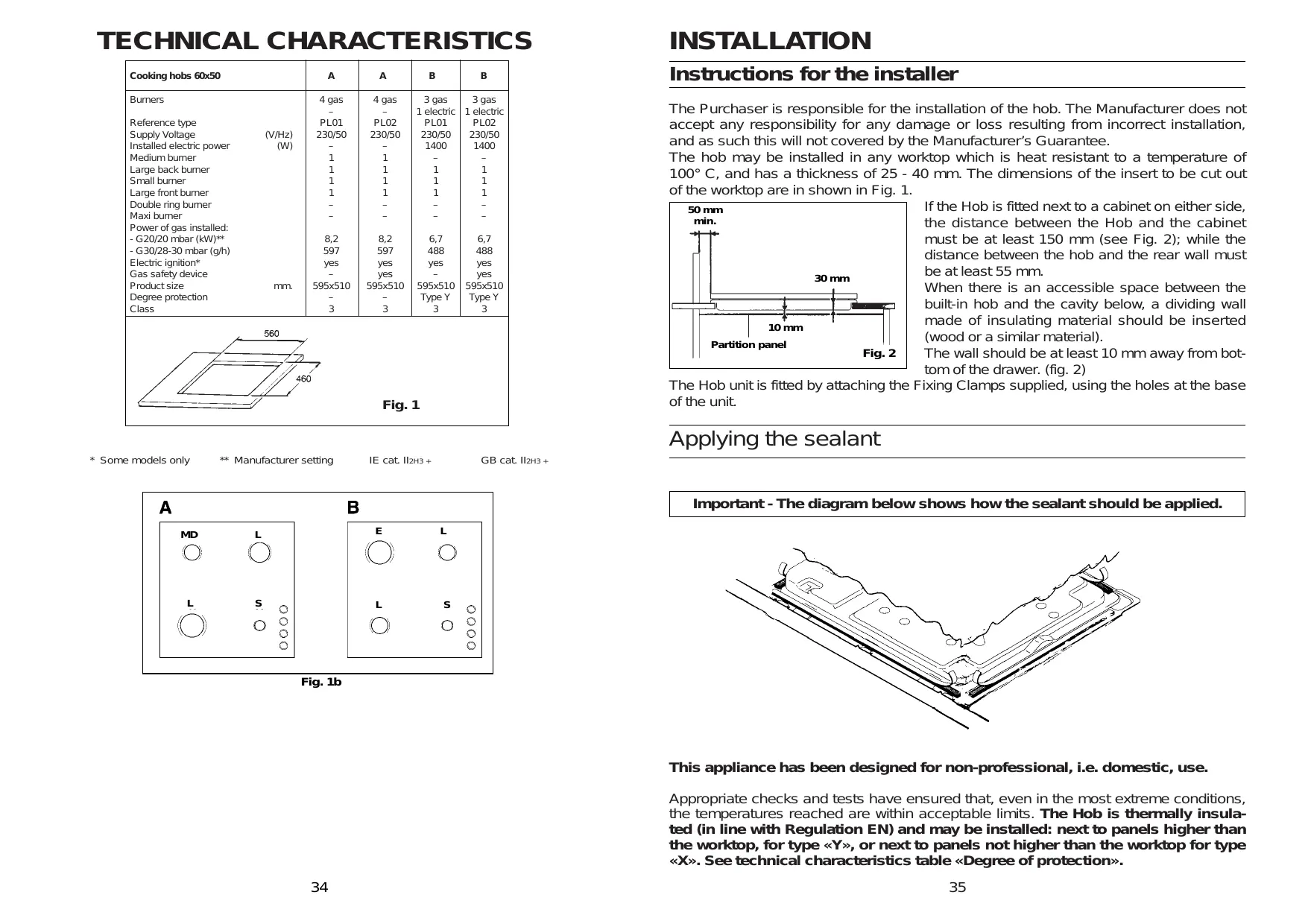 Fig. 1b This appliance has been designed for non-professional, i.e. domestic, use. Appropriate checks and tests have ensured that, even in the most extreme conditions, the temperatures reached are within acceptable limits. The Hob is thermally insulated (in line with Regulation EN) and may be installed: next to panels higher than the worktop, for type «Y», or next to panels not higher than the worktop for type «X». See technical characteristics table «Degree of protection».