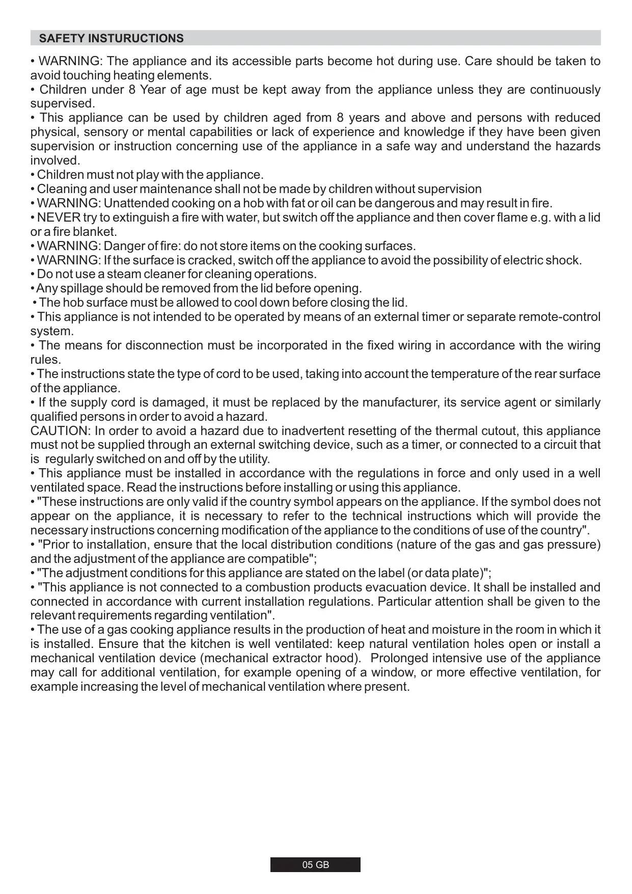 - The use of a gas cooking appliance results in the production of heat and moisture in the room in which it is installed. Ensure that the kitchen is well ventilated: keep natural ventilation holes open or install a mechanical ventilation device (mechanical extractor hood). Prolonged intensive use of the appliance may call for additional ventilation, for example opening of a window, or more effective ventilation, for example increasing the level of mechanical ventilation where present. 05 GB