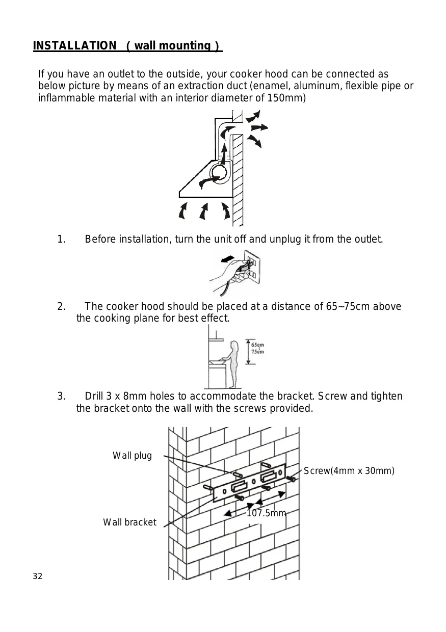 Drill 2 x 8mm holes to accommodate the plate II. Screw and tighten the plate II onto the wall with 2 screws provided. ii. Assembly the chimney onto the unit and fix it with 2 screws. Plate II Screw 4mm x 8mm Wall plug Screw (4mm x 30mm)