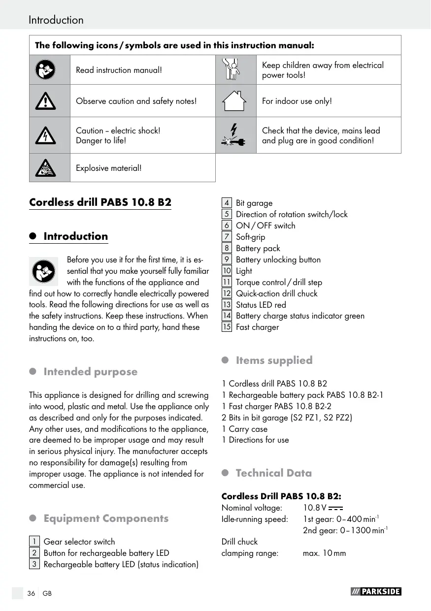 Introduction The following icons / symbols are used in this instruction manual: Read instruction manual! Keep children away from electrical power tools! Observe caution and safety notes! For indoor use only! Caution – electric shock! Danger to life! Check that the device, mains lead and plug are in good condition! Explosive material! Cordless drill PABS 10.8 B2