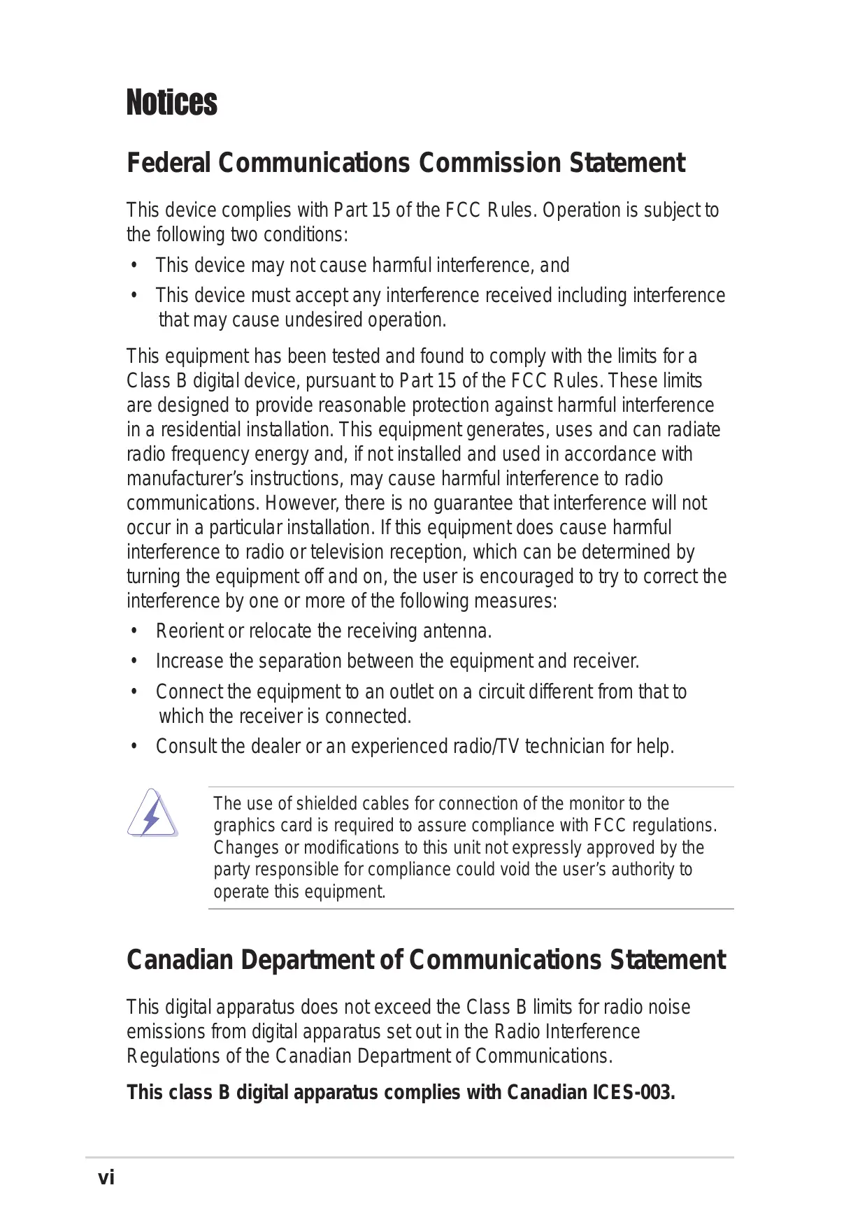 Notices Federal Communications Commission Statement This device complies with Part 15 of the FCC Rules. Operation is subject to the following two conditions: *_ This device may not cause harmiul interference, and *_ This device must accept any interference received including interference that may cause undesired operation. This equipment has been tested and found to comply with the limits for a Class B digital device, pursuant to Part 15 ofthe FCC Rules. These limits are designed to provide reasonable protection against harmful interference in a residential installation. This equipment generates, uses and can radiate radio frequency energy and, if not installed and used in accordance with manufacturer's instructions, may cause harmful interference to radio communications. However, there is no guarantee that interference will not occur in a particular installation. If this equipment does cause harmiul interference to radio or television reception, which can be determined by turning the equipment off and on, the user is encouraged to try to correct the interference by one or more of the following measures: *__Reorient or relocate the receiving antenna. *_ Increase the separation between the equipment and receiver. + Connectthe equipment to an outlet on a circuit different from that to which the receiver is connected. + Consultthe dealer or an experienced radio/TV technician for help. ; The use of shielded cables for connection of the monitor to the A graphics card is required to assure compliance with FCC regulations. Changes or modifications to this unit not expressly approved by the party responsible for compliance could void the user's authority to operate this equipment. Canadian Department of Communications Statement This digital apparatus does not exceed the Class B limits for radio noise emissions from digital apparatus set out in the Radio Interference Regulations of the Canadian Department of Communications. This class B digital apparatus complies with Canadian ICES-003.