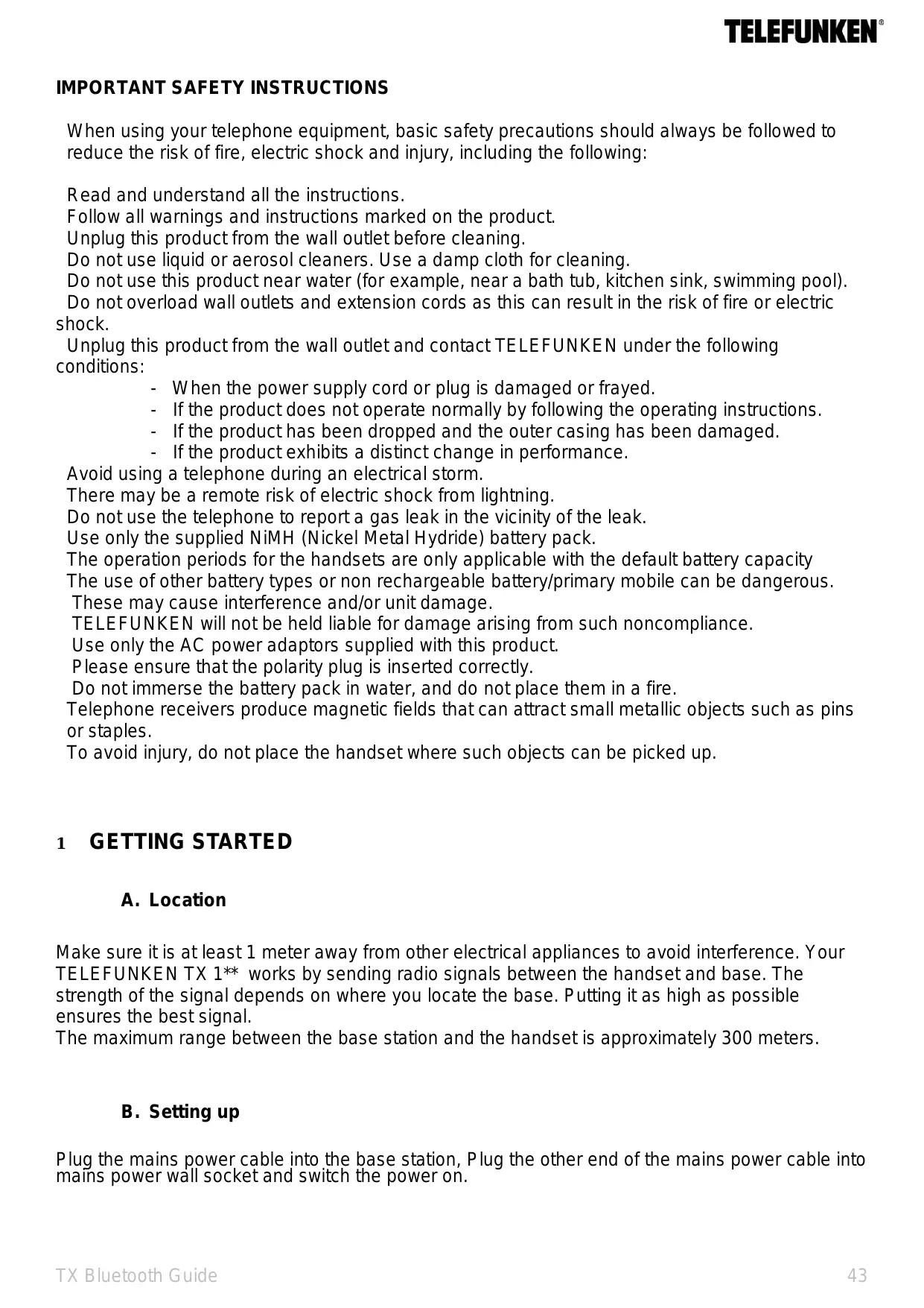 - Sometimes your TELEFUNKEN TX 1^ can interfere with other electrical equipment if it is placed too close. It is recommended that you place your TELEFUNKEN TX 1^ at least one metre away from electrical appliances or metal obstructions to avoid any risk of interference.
