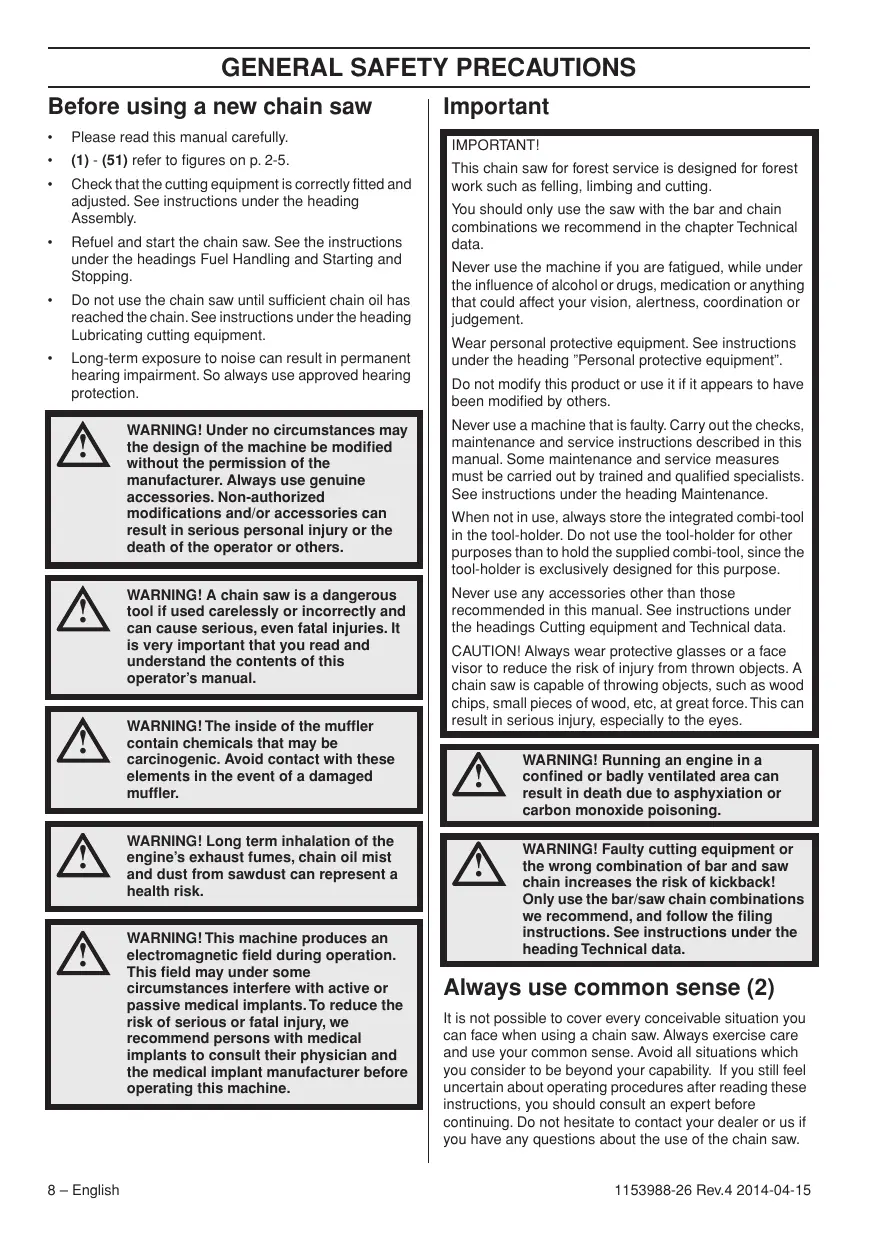 WARNING! Running an engine in a confined or badly ventilated area can result in death due to asphyxiation or carbon monoxide poisoning. WARNING! Faulty cutting equipment or the wrong combination of bar and saw chain increases the risk of kickback! Only use the bar/saw chain combinations we recommend, and follow the filing instructions. See instructions under the heading Technical data. Always use common sense (2) It is not possible to cover every conceivable situation you can face when using a chain saw. Always exercise care and use your common sense. Avoid all situations which you consider to be beyond your capability. If you still feel uncertain about operating procedures after reading these instructions, you should consult an expert before continuing. Do not hesitate to contact your dealer or us if you have any questions about the use of the chain saw. 1153988-26 Rev.4 2014-04-15