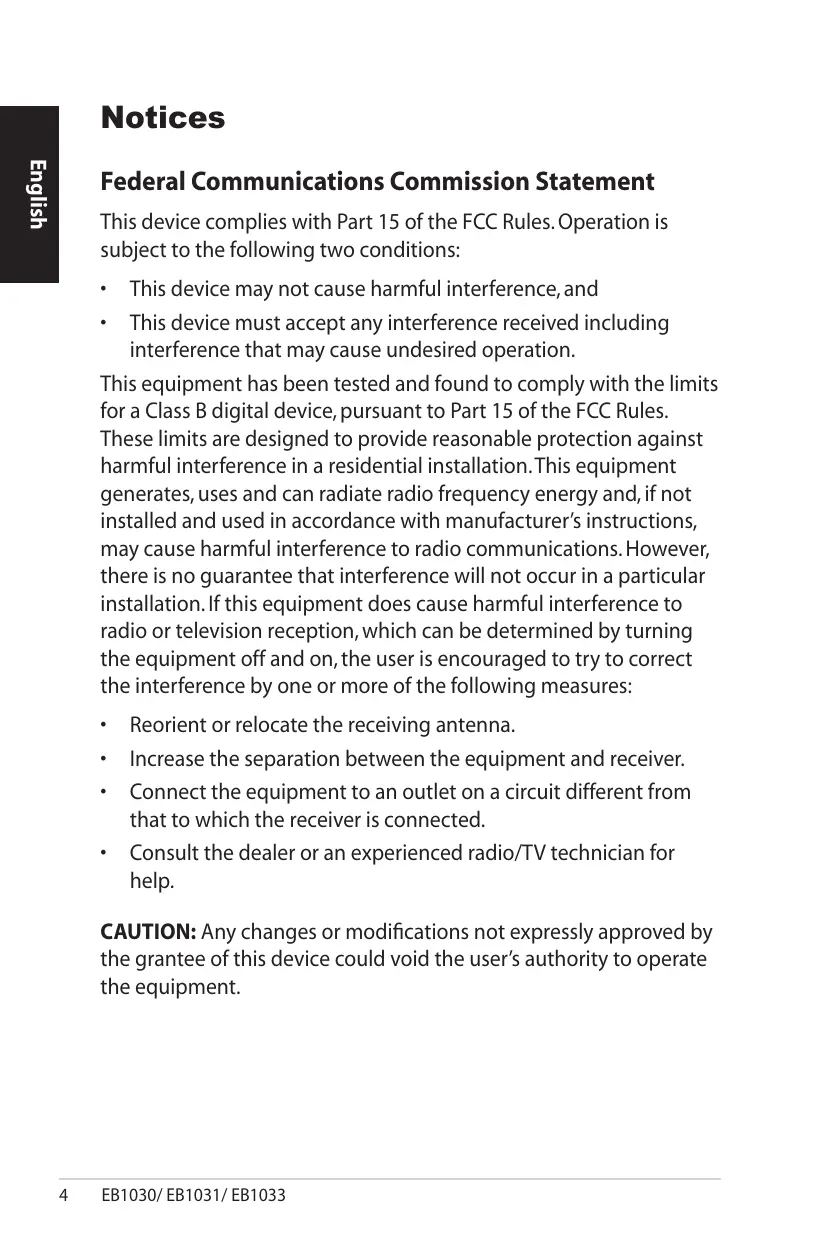 Notices English Federal Communications Commission Statement This device complies with Part 15 of the FCC Rules. Operation is subject to the following two conditions: