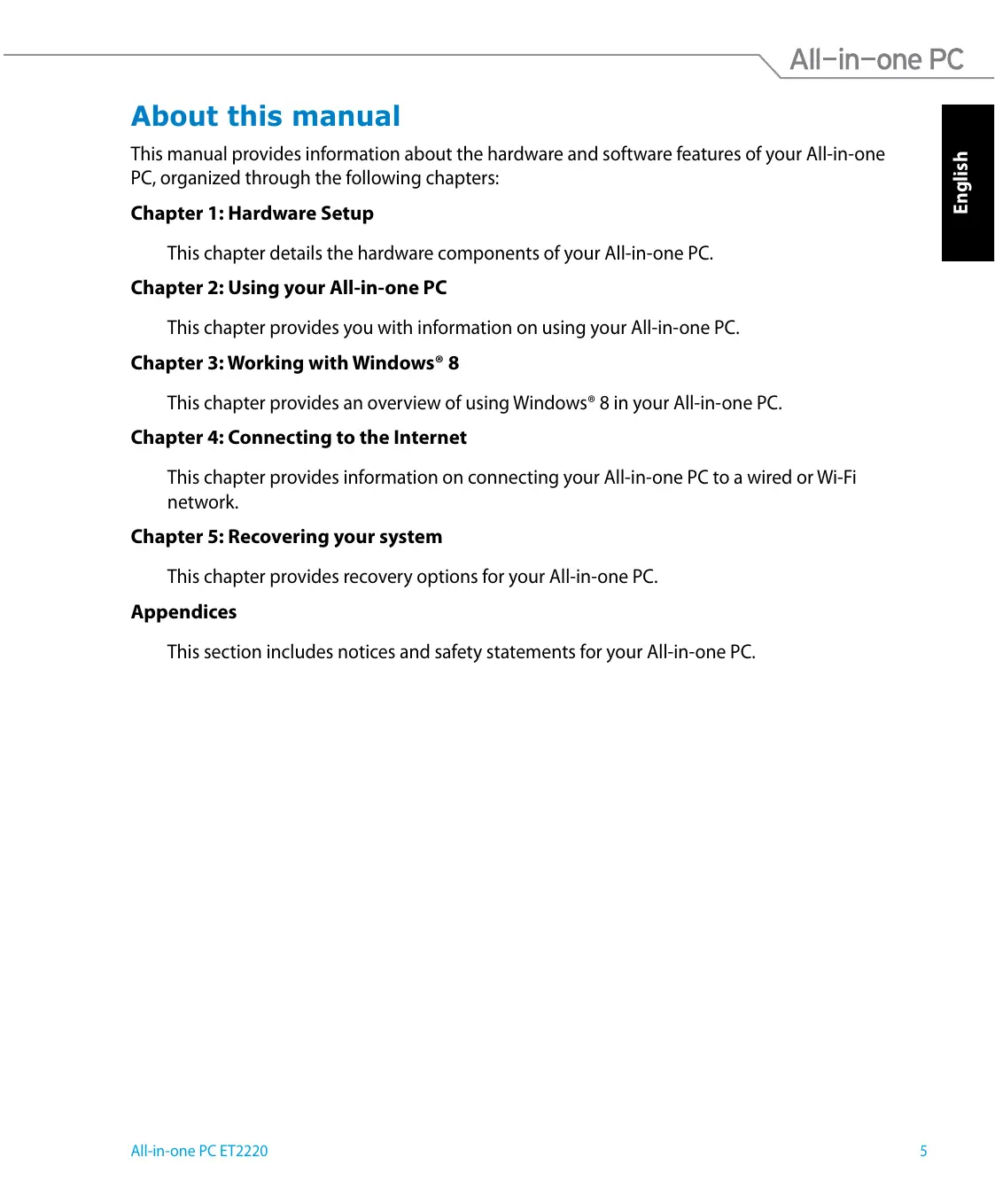 This chapter provides recovery options for your All-in-one PC. Appendices This section includes notices and safety statements for your All-in-one PC. Allin-one PC ET2220 5