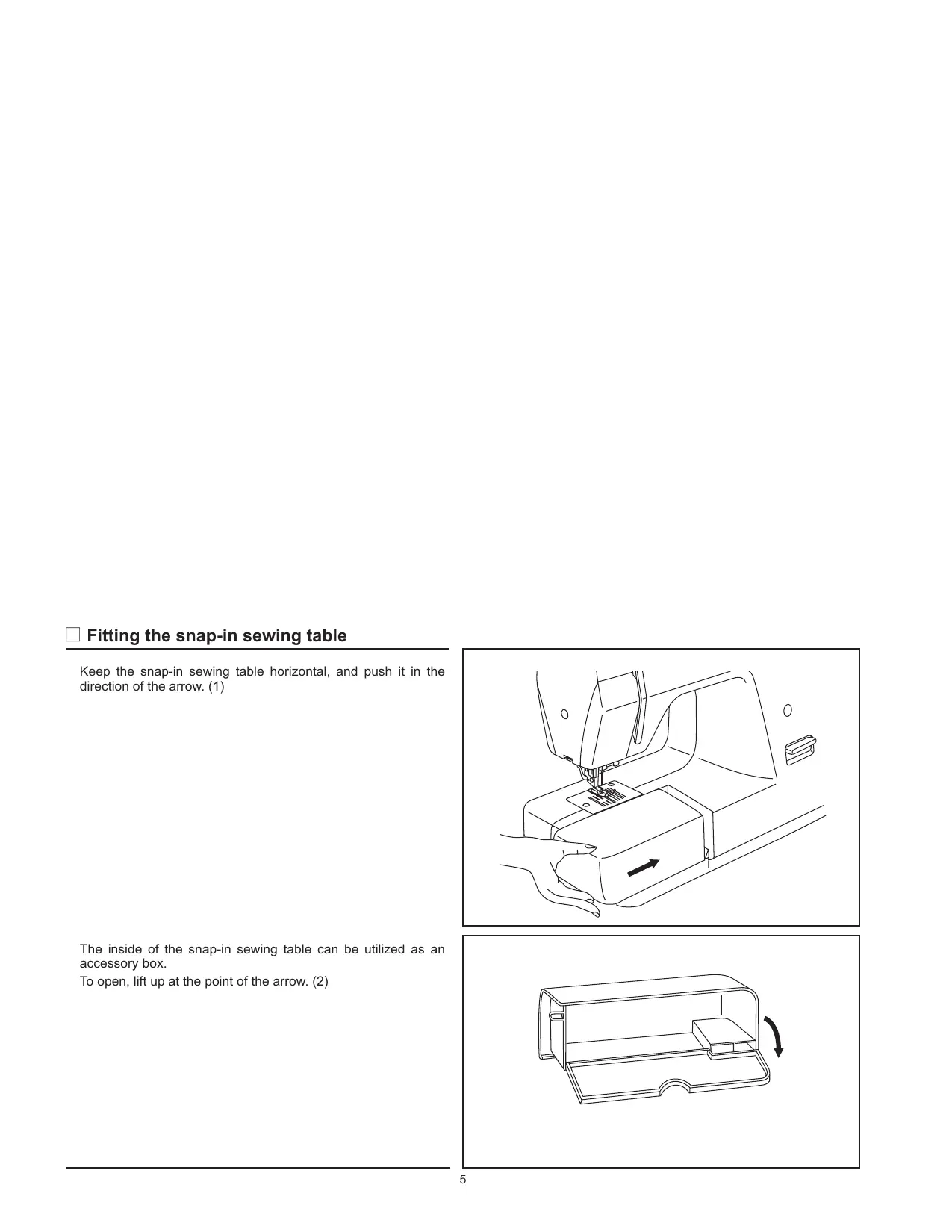 [1 Fitting the snap-in sewing table Keep the snap-in sewing table horizontal, and push it in the direction of the arrow. (1) The inside of the snap-in sewing table can be utlized as an accessory box. To open, lift up at the point of the arrow. (2)