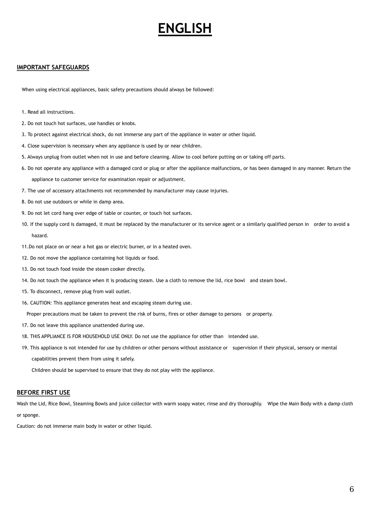 ENGLISH IMPORTANT SAFEGUARDS When using electrical appliances, basic safety precautions should always be followed: