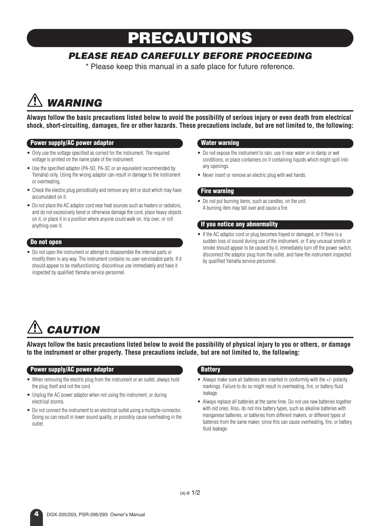 - Please keep this manual in a safe place for future reference. À WARNING Always follow the basic precautions listed below to avoid the possibility of serious injury or even death from electrical shock, short-circuiting, damages, fire or other hazards. These precautions include, but are not limited to, the following: Power supply/AC power adaptor + Only use the voltage specified as correct for the instrument. The required voltage is printed on the name plate of the instrument. + Use the specified adaptor (PA-5D, PA-3C or an equivalent recommended by Yamaha) only. Using the wrong adaptor can result in damage to the instrument or overheating. + Check the electric plug periodically and remove any dirt or dust which may have accumulated on it + Do not place the AC adaptor cord near heat sources such as heaters or radiators, and do not excessively bend or otherwise damage the cord, place heavy objects on it, or place it in a position where anyone could walk on, trip over, or roll anything over it. < Do not open the instrument or attempt to disassemble the internal parts or modify them in any way. The instrument contains no user-serviceable parts. lf it Should appear to be malfunctioning, discontinue use immediately and have it inspected by qualified Yamaha service personnel À CAUTION + Do not expose the instrument to rain, use it near water or in damp or wet conditions, or place containers on it containing liquids which might spill into any openings. e Never insert or remove an electric plug with wet hands. Fire warning < Do not put burning items, such as candles, on the unit. À burning item may fall over and cause a fire. If you notice any abnormality _lfthe AC adaptor cord or plug becomes frayed or damaged, or if there is a sudden loss of sound during use of the instrument, or if any unusual smells or smoke should appear to be caused by it, immediately turn off the power switch, disconnect the adaptor plug from the outlet, and have the instrument inspected by qualified Yamaha service personnel Always follow the basic precautions listed below to avoid the possibility of physical injury to you or others, or damage to the instrument or other property. These precautions include, but are not limited to, the following: Power supply/AC power adaptor + When removing the electric plug from the instrument or an outlet, always hold the plug itself and not the cord. + Unplug the AC power adaptor when not using the instrument, or during electrical storms. < Do not connect the instrument to an electrical outlet using a multiple-connector. Doing so can result in lower sound quality, or possibly cause overheating in the outlet. Battery < Always make sure all batteries are inserted in conformity with the +/- polarity markings. Failure to do so might result in overheating, fire, or battery fluid leakage. < Always replace all batteries at the same time. Do not use new batteries together with old ones. Also, do not mix battery types, such as alkaline batteries with manganese batteries, or batteries from different makers, or different types of batteries from the same maker, since this can cause overheating, fire, or battery fluid leakage. {a)-8 1/2 a DGX-205/203, PSR-295/293 Owner's Manual