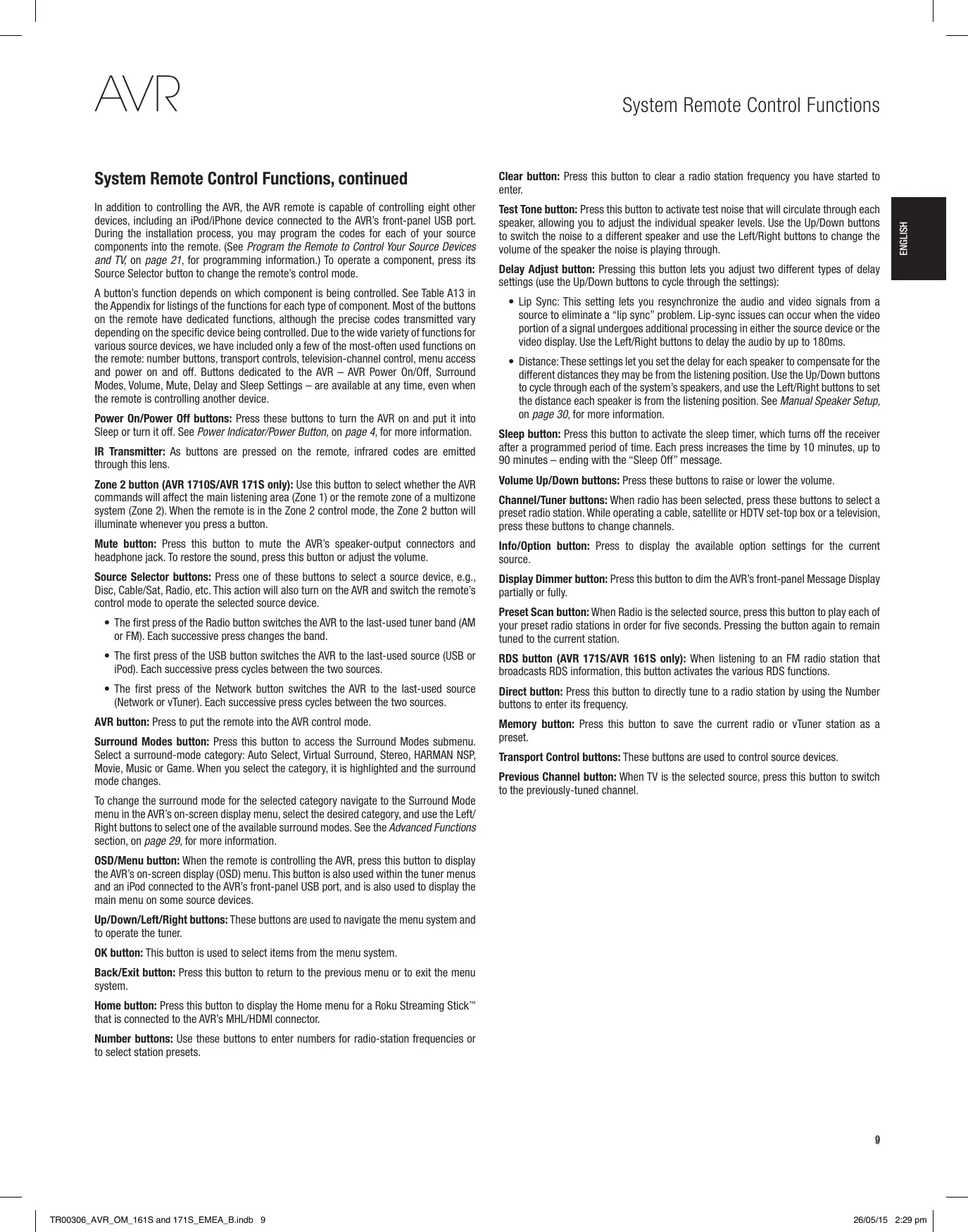 TR00306_AVR_OM_161S and 171S_EMEA_B.indb 8 26/05/15 2:29 pm System Remote Control Functions System Remote Control Functions, continued Clear button: Press this button to clear a radio station frequency you have started to enter. In addition to controlling the AVR, the AVR remote is capable of controlling eight other devices, including an iPod/iPhone device connected to the AVR’s front-panel USB port. During the installation process, you may program the codes for each of your source components into the remote. (See Program the Remote to Control Your Source Devices and TV, on page 21, for programming information.) To operate a component, press its Source Selector button to change the remote’s control mode. Test Tone button: Press this button to activate test noise that will circulate through each speaker, allowing you to adjust the individual speaker levels. Use the Up/Down buttons to switch the noise to a different speaker and use the Left/Right buttons to change the volume of the speaker the noise is playing through. A button’s function depends on which component is being controlled. See Table A13 in the Appendix for listings of the functions for each type of component. Most of the buttons on the remote have dedicated functions, although the precise codes transmitted vary depending on the specific device being controlled. Due to the wide variety of functions for various source devices, we have included only a few of the most-often used functions on the remote: number buttons, transport controls, television-channel control, menu access and power on and off. Buttons dedicated to the AVR – AVR Power On/Off, Surround Modes, Volume, Mute, Delay and Sleep Settings – are available at any time, even when the remote is controlling another device. Power On/Power Off buttons: Press these buttons to turn the AVR on and put it into Sleep or turn it off. See Power Indicator/Power Button, on page 4, for more information. IR Transmitter: As buttons are pressed on the remote, infrared codes are emitted through this lens. Delay Adjust button: Pressing this button lets you adjust two different types of delay settings (use the Up/Down buttons to cycle through the settings):