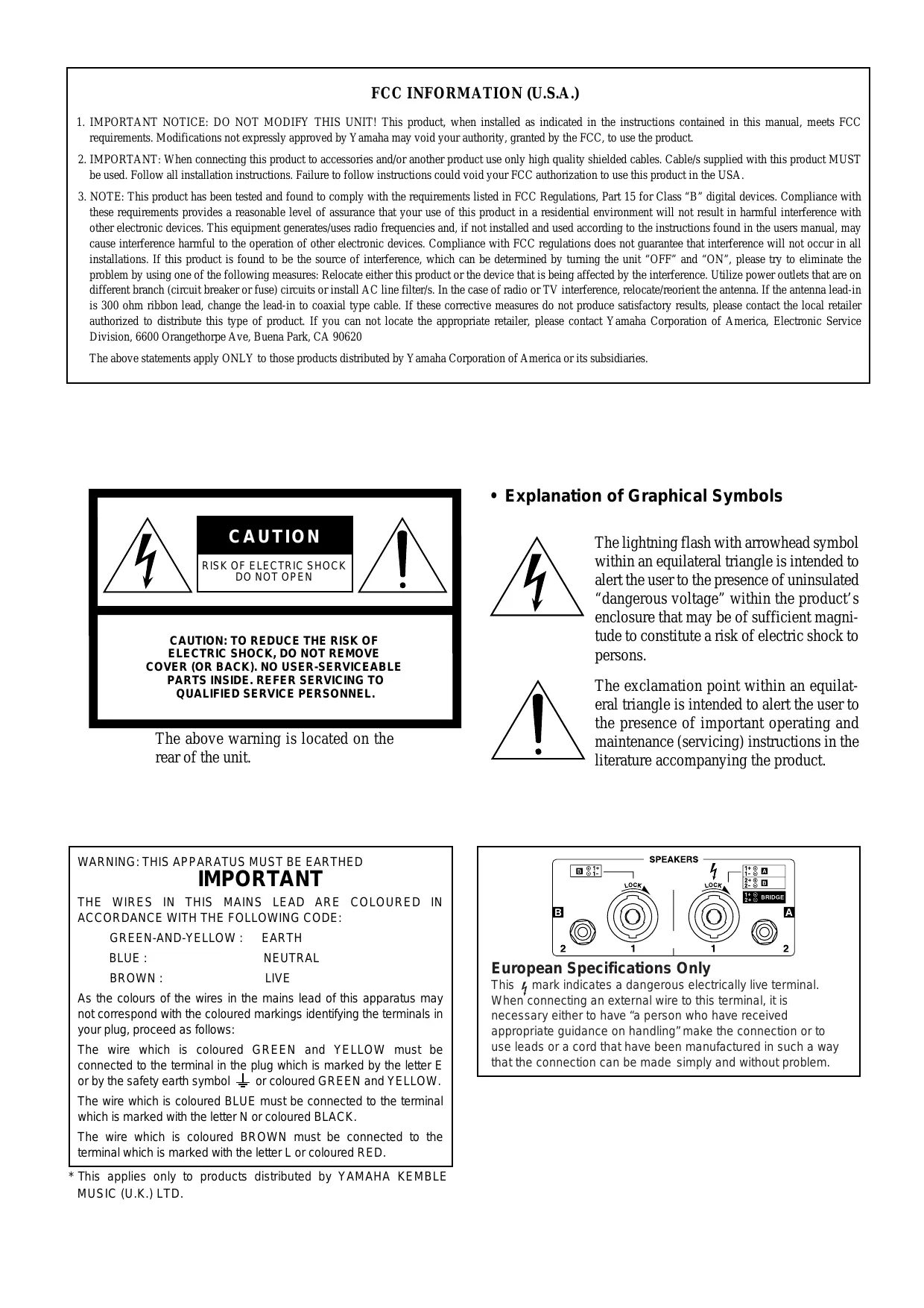 NOTE: This product has been tested and found to comply with the requirements listed in FCC Regulations, Part 15 for Class “B” digital devices. Compliance with these requirements provides à reasonable level of assurance that your use of this product in a residential environment will not result in harmful interference with other electronic devices. This equipment generates/uses radio frequencies and, if not installed and used according to the instructions found in the users manual, may cause interference hammful to the operation of other electronic devices. Compliance with FCC regulations does not guarantee that interference will not occur in all installations. If this product is found to be the source of interference, which can be determined by tuming the unit "OFF" and “ON”, please try to eliminate the problem by using one of the following measures: Relocate either this product or the device that is being affected by the interference. Utilize power outlets that are on different branch (circuit breaker or fuse) circuits or install AC line filterfs. In the case of radio or TV interference, relocate/reorient the antenne. If the antenna lead-in is 300 ohm ribbon lead, change the lead-in to coaxial type cable. If these corrective measures do not produce satisfactory results, please contact the local retailer authorized to distribute this type of product. If you can not locate the appropriate retailer, please contact Yamaha Corporation of America, Electronic Service Division, 6600 Orangethorpe Ave, Buena Park, CA 90620 The above statements apply ONLY to those products distributed by Yamaha Corporation of America or its subsidiaries. + Explanation of Graphical Symbols Thelighining flash with arrowhead symbol within an equilateral triangle is intended to alert the user to the presence of uninsulated “dangerous voltage” within the product’s enclosure that may be of sufficient magni- tude to constitute a risk of electric shock to persons.