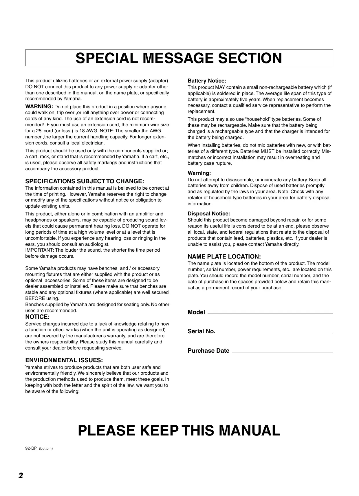 Do not attempt to disassemble, or incinerate any battery. Keep all batteries away from children. Dispose of used batteries promptly and as regulated by the laws in your area. Note: Check with any retailer of household type batteries in your area for battery disposal information. Disposal Notice: Should this product become damaged beyond repair, or for some reason its useful life is considered to be at an end, please observe all local, state, and federal regulations that relate to the disposal of products that contain lead, batteries, plastics, etc. lf your dealer is unable to assist you, please contact Yamaha directly. NAME PLATE LOCATION: The name plate is located on the bottom of the product. The model number, serial number, power requirements, etc., are located on this plate. You should record the model number, serial number, and the date of purchase in the spaces provided below and retain this man- ual as a permanent record of your purchase. Model Serial No. Purchase Date