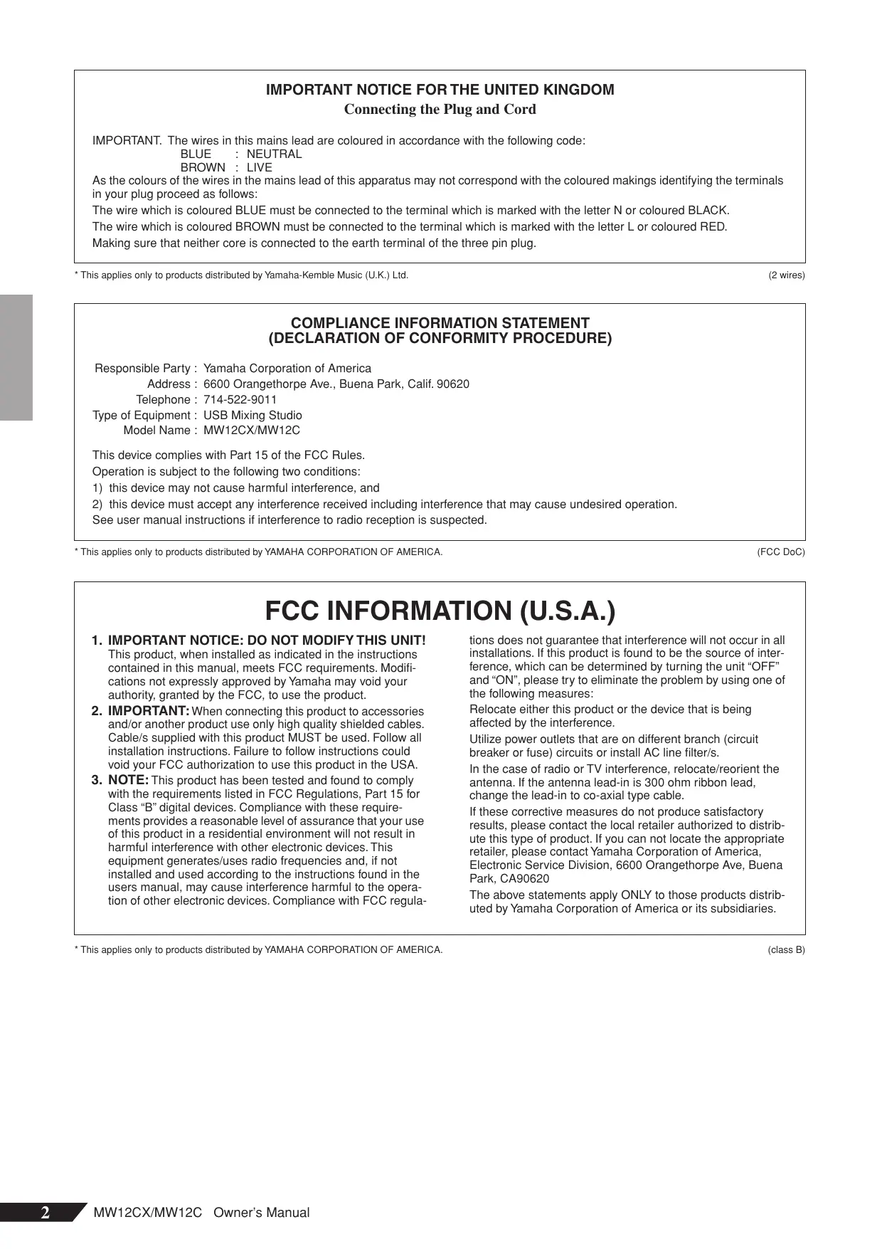 - This applies only to products distributed by YAMAHA CORPORATION OF AMERICA. MWi2CX/MW12C_ Owner's Manual (class B)