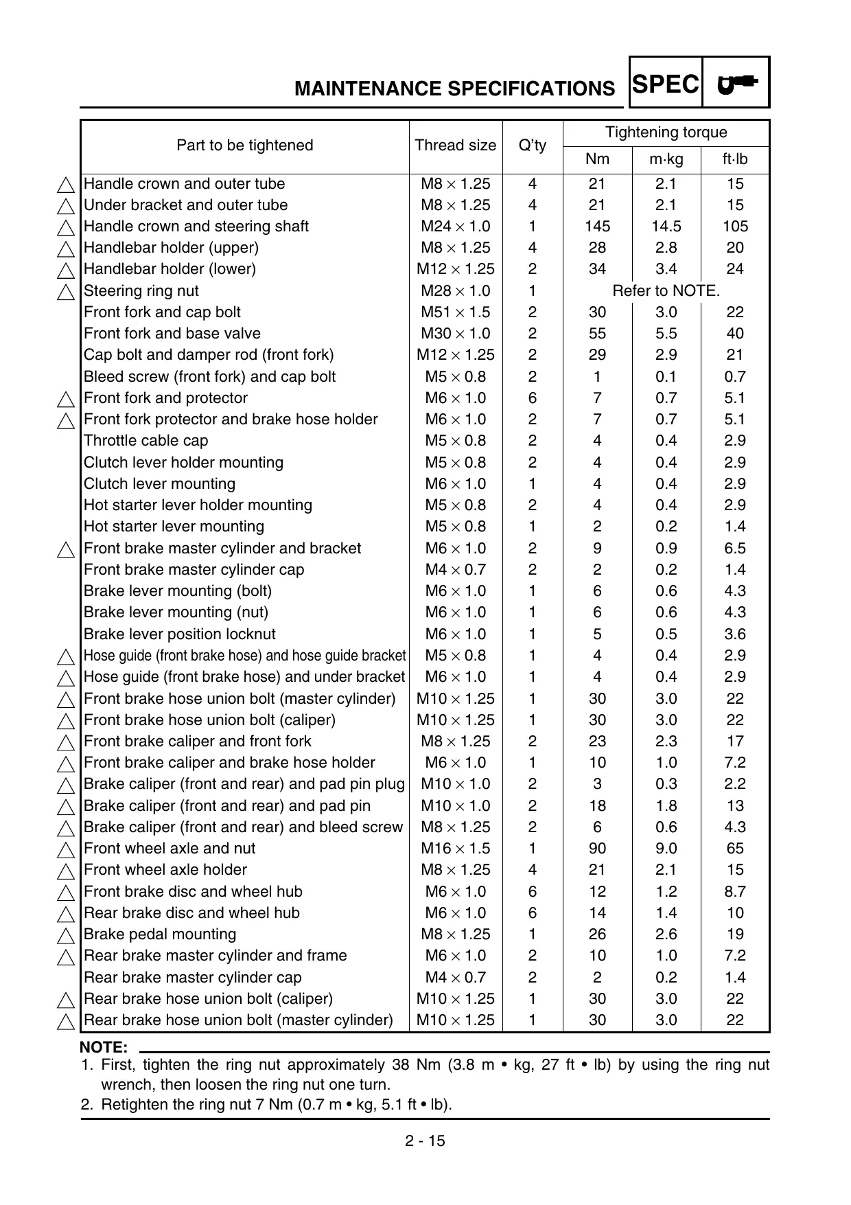 • Front fork NOTE: • If any of the following symptoms is experienced with the standard position as the base, make resetting by reference to the adjustment procedure given in the same chart. • Before any change, set the rear shock absorber sunken length to the standard figure 90 ~ 100 mm (3.5 ~ 3.9 in). Section Symptom