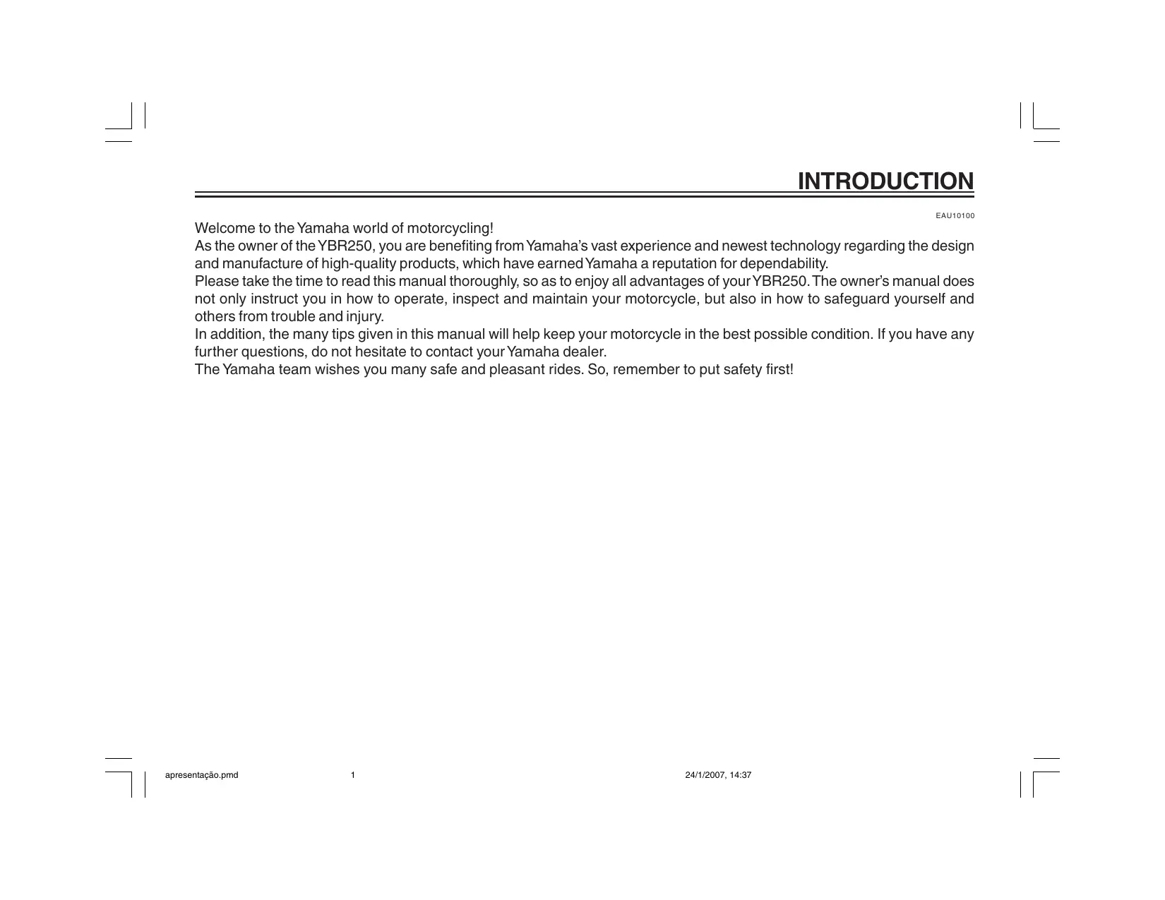 INTRODUCTION EAU10100 Welcome to the Yamaha world of motorcyclingl! As the owner of the YBR250, you are benefiting from Yamaha's vast experience and newest technology regarding the design and manufacture of high-quality products, which have earned Yamaha a reputation for dependability. Please take the time to read this manual thoroughly, so as to enjoy all advantages of your YBR250. The owners manual does not only instruct you in how to operate, inspect and maintain your motorcycle, but also in how to safeguard yourself and others from trouble and injury. In addition, the many tips given in this manual will help keep your motorcycle in the best possible condition. If you have any further questions, do not hesitate to contact your Yamaha dealer. The Yamaha team wishes you many safe and pleasant rides. So, remember to put safety first! ”] | apresentaçäo.pmd 1 24/1/2007, 14:37