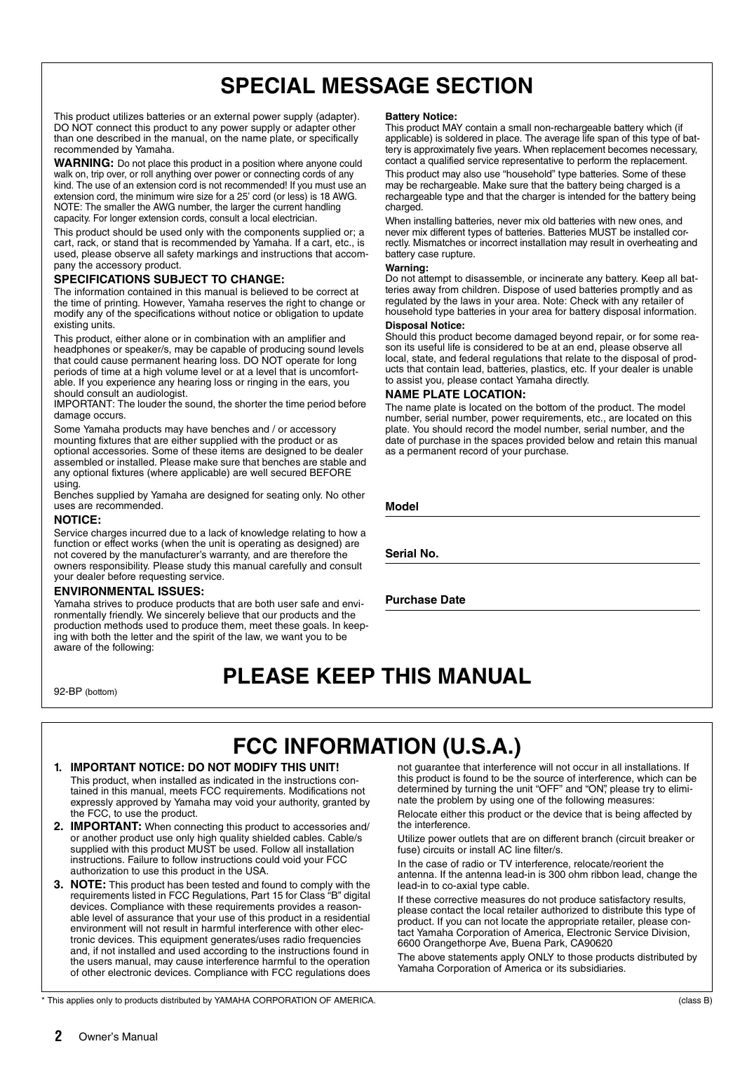 Do not attempt to disassemble, or ininerate any battery. Keep all bat- teries away from children. Dispose of used batteries promptly and as regulated by the laws in your area. Note: Check with any retailer of household type batteries in your area for battery disposal information Disposal Notice: Should this product become damaged beyond repair, or for some rea- son its useful lie is considered to be at an end, please observe all local, state, and federal regulations that relate to the disposal of prod- ucts that contain lead, batieries, plastics, etc. If your dealer is unable to assist you, please contact Yamaha directly. NAME PLATE LOCATION: The name plate is located on the bottom of the product. The model number, serial number, power requirements, etc, are located on this plate. You should record the model number, serial number, and the date of purchase in the spaces provided below and retain this manual as a permanent record of your purchase. Model Serial No. Purchase Date