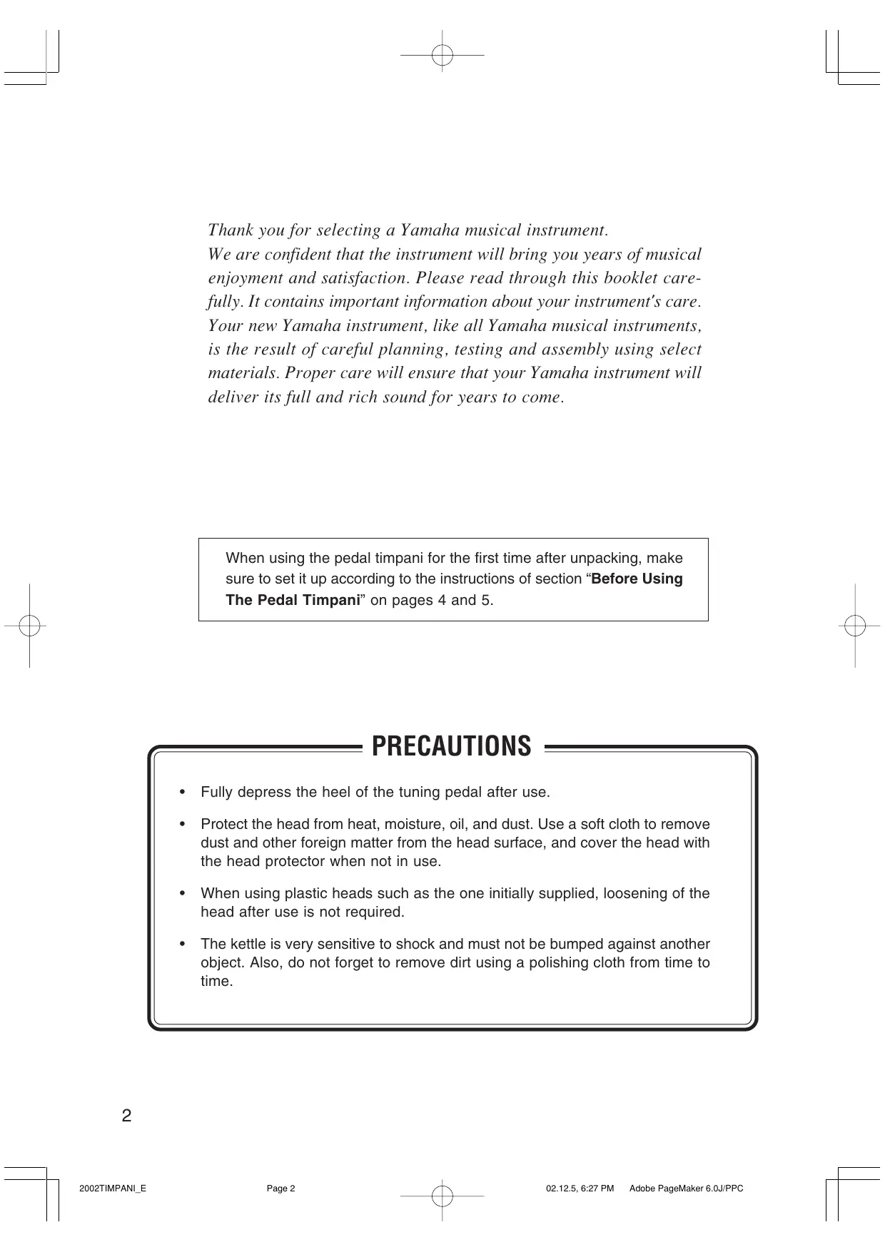 Thank you for selecting a Yamaha musical instrument. We are confident that the instrument will bring you years of musical enjoyment and satisfaction. Please read through this booklet care- fully. It contains important information about your instrument's care. Your new Yamaha instrument, like all Yamaha musical instruments, is the result of careful planning, testing and assembly using select materials. Proper care will ensure that your Yamaha instrument will deliver its full and rich sound for years to come. When using the pedal timpani for the first time after unpacking, make sure to set it up according to the instructions of section “Before Using The Pedal Timpani” on pages 4 and 5. + Fully depress the heel of the tuning pedal after use. + Protect the head from heat, moisture, oil, and dust. Use a soft cloth to remove dust and other foreign matter from the head surface, and cover the head with the head protector when not in use. +__ When using plastic heads such as the one initially supplied, loosening of the head after use is not required. + The ketile is very sensitive to shock and must not be bumped against another object. Also, do not forget to remove dirt using a polishing cloth from time to time. I 2002TIMPANLE Page 2 A 02.125, 6:27 PM Adobe PageMaker 6.Qu/PPC: New
