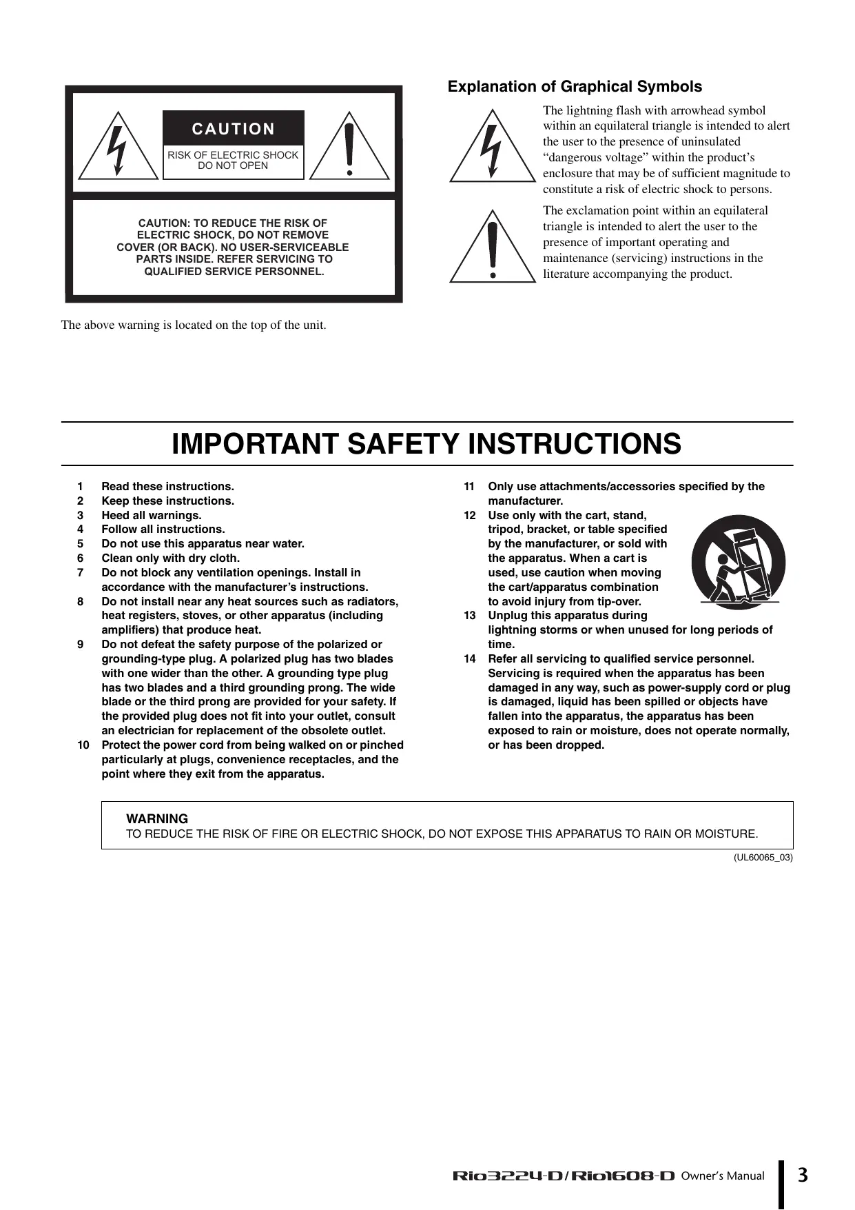 Read these instructions. 11 Keep these instructions. Heed all warnings. Follow all instructions. Do not use this apparatus near water. Clean only with dry cloth. Do not block any ventilation openings. Install in accordance with the manufacturer’s instructions. Do not install near any heat sources such as radiators, heat registers, stoves, or other apparatus (including amplifiers) that produce heat. Do not defeat the safety purpose of the polarized or grounding-type plug. À polarized plug has two blades with one wider than the other. À grounding type plug has two blades and a third grounding prong. The wide blade or the third prong are provided for your safety. If the provided plug does not fit into your outlet, consult an electrician for replacement of the obsolete outlet. Protect the power cord from being walked on or pinched particularly at plugs, convenience receptacles, and the point where they exit from the apparatus. Only use attachments/accessories specified by the manufacturer. Use only with the cart, stand, tripod, bracket, or table specified by the manufacturer, or sold with the apparatus. When a cart is used, use caution when moving the cart/apparatus combination to avoid injury from tip-over. Unplug this apparatus during lightning storms or when unused for long periods of time. Refer all servicing to qualified service personnel. Servicing is required when the apparatus has been damaged in any way, such as power-supply cord or plug is damaged, liquid has been spilled or objects have fallen into the apparatus, the apparatus has been exposed to rain or moisture, does not operate normally, or has been dropped. WARNING TO REDUCE THE RISK OF FIRE OR ELECTRIC SHOCK, DO NOT EXPOSE THIS APPARATUS TO RAIN OR MOISTURE. (UL60065_03) Rio322U-D/Rio1608-D Owner's Manual