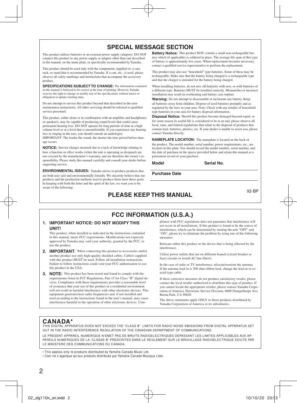 requirements listed in FCC Regulations, Part 15 for Class *B” digital de- vices. Compliance with these requirements provide à reasomable level of assurance that your use of this produet in a residential environment ill not result in harmful interference with ler clectromie devices. This. equipment gencratesAses radio Frequencies and, if not installed and used according Lo the instructions found in the users manual, may cause interference harmful to the operation of other electronic devices. Com. requesting enice Model Serial No. ENVIRONMENTAL ISSUES: Yamaha sives 1 produce product hat are bo user safe and environmental friendly. We sincerely believe hat our PUrChaSe Date products and he production method used L produce (hem mcct these goas. Tu keine with Both he leer and he spirit of he Lay, we want you 1 be are of ie Following: 92-BP