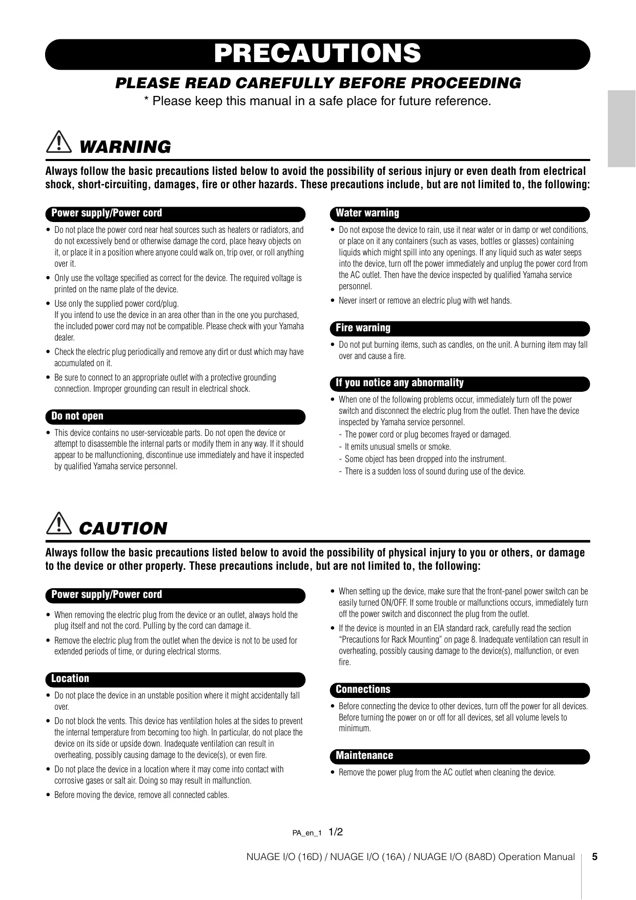 - Please keep this manual in a safe place for future reference. À WARNING Always follow the basic precautions listed below to avoid the possibility of serious injury or even death from electrical shock, short-circuiting, damages, fire or other hazards. These precautions include, but are not limited to, the following: Power supply/Power cord Do not place the power cord near heat sources such as heaters or radiators, and do not excessively bend or otherwise damage the cord, place heavy objects on it, or place it in a position where anyone could walk on, trip over, or roll anything over it Only use the voltage specified as correct for the device. The required voltage is printed on the name plate of the device. Use only the supplied power cord/plug. If you intend to use the device in an area other than in the one you purchased, the included power cord may not be compatible. Please check with your Yamaha dealer. Check the electric plug periodically and remove any dirt or dust which may have accumulated on it. Be sure to connect to an appropriate outlet with a protective grounding connection. Improper grounding can result in electrical shock. This device contains no user-serviceable parts. Do not open the device or attempt to disassemble the internal parts or modify them in any way. If it should appear to be malfunctioning, discontinue use immediately and have it inspected by qualified Yamaha service personnel: À cAUTION Water warning Do not expose the device to rain, use it near water or in damp or wet conditions, or place on it any containers (such as vases, botiles or glasses) containing liquids which might spill into any openings. If any liquid such as water seeps into the device, turn off the power immediately and unplug the power cord from the AC outlet. Then have the device inspected by qualified Yamaha service personnel Never insert or remove an electric plug with wet hands. Fire warning + Do not put burning items, such as candies, on the unit. À burning item may fall over and cause à fire. If you notice any abnormality + When one of the following problems occur, immediately turn off the power switch and disconnect the electric plug from the outlet. Then have the device inspected by Yamaha service personnel - The power cord or plug becomes frayed or damaged. - Itemits unusual smells or smoke. - Some object has been dropped into the instrument. - There is a sudden loss of sound during use of the device. Always follow the basic precautions listed below to avoid the possibility of physical injury to you or others, or damage to the device or other property. These precautions include, but are not limited to, the following: Power supply/Power cord + When removing the electric plug from the device or an outlet, always hold the plug itself and not the cord. Pulling by the cord can damage it. < Remove the electric plug from the outlet when the device is not to be used for extended periods of time, or during electrical storms. Do not place the device in an unstable position where it might accidentally fall over. Do not block the vents. This device has ventilation holes at the sides to prevent the internal temperature from becoming too high. In particular, do not place the device on its side or upside down. Inadequate ventilation can result in overheating, possibly causing damage to the device(s), or even fire. Do not place the device in a location where it may come into contact with corrosive gases or salt air. Doing so may result in malfunction. Before moving the device, remove all connected cables. + When setting up the device, make sure that the front-panel power switch can be easily turned ON/OFF. lf some trouble or malfunctions occurs, immediately turn off the power switch and disconnect the plug from the outlet. <_lfthe device is mounted in an ElA standard rack, carefully read the section “Precautions for Rack Mounting” on page 8. Inadequate ventilation can result in overheating, possibly causing damage to the device(s), malfunction, or even fire. < Before connecting the device to other devices, turn off the power for all devices. Before turning the power on or off for all devices, set all volume levels to minimum: + Remove the power plug from the AC outlet when cleaning the device. PAen1 1/2 NUAGE 1/0 (16D) / NUAGE |/0 (16A) / NUAGE 1/0 (8A8D) Operation Manual