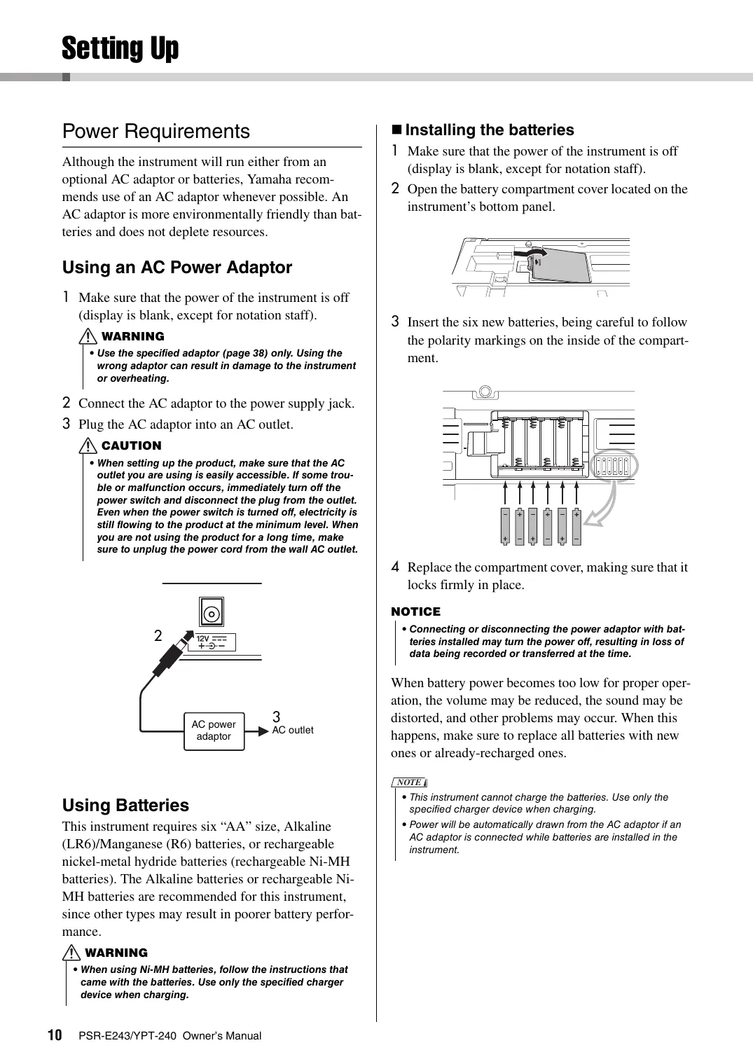 AG power AC outlet adaptor Using Batteries This instrument requires six “AA” size, Alkaline (LR6)/Manganese (R6) batteries, or rechargeable nickel-metal hydride batteries (rechargeable Ni-MH batteries). The Alkaline batteries or rechargeable Ni- MH batteries are recommended for this instrument, since other types may result in poorer battery perfor- mance. WARNING + When using Ni-MH batteries, follow the instructions that came with the batteries. Use only the specified charger device when charging. 10 PSR-E243/YPT-240 Owners Manual Minstalling the batteries 1 Make sure that the power of the instrument is off (display is blank, except for notation staff). 2 Open the battery compartment cover located on the instrument’s bottom panel. 3 Insert the six new batteries, being careful to follow the polarity markings on the inside of the compart- ment.