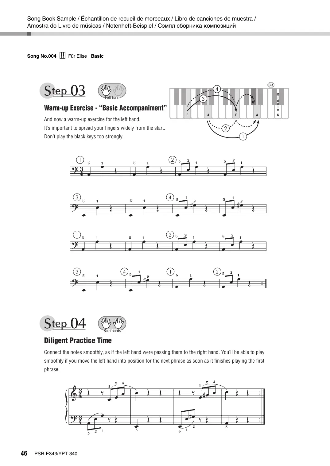 - CGopHuk kounosuuñ Song book npenOCTABNAETCA TONEKO HA AHFnMACKOM, PPAHLYACKOM, HEMELKOM 4 HCTIAHCKOM ASbIKAX. STOT npuMep npencTasnAeT CÉOPHAK KOMMIOSHUUÜ HA AHTNMACKOM ABbIKE. Für Elise Lu Betoven Song No.004 Für Elie — with Step Map Für lis is an lime cassical favorite. The beautiful, welknoun melody is repeated a number of times. In each step you won't be practicing alone. You have a wonderful orchestra to back you up! Fit listen to the example a few times. It won't be long before you want to start playing it voursel! Step 01 Warm-up Exercise - “The Semitone Mystery Step 02 Diligent Practice Time ……. . Step 03 Warm-up Exercise - “Basic Accompaniment Step 04 Diligent Practice Time … Step 05 First Half Review ……… Step 06 Diligent Practice Time …… . Step 07 Warm-up Exercise - “The Jump Competition” Step 08 “EEEEE!”" Step 09 “Left! Right! Left! Right! Step 10 Second Half Review Step 11_ Play the Whole Song! …… . ue . L > 40 PSR-E343/YPT-340