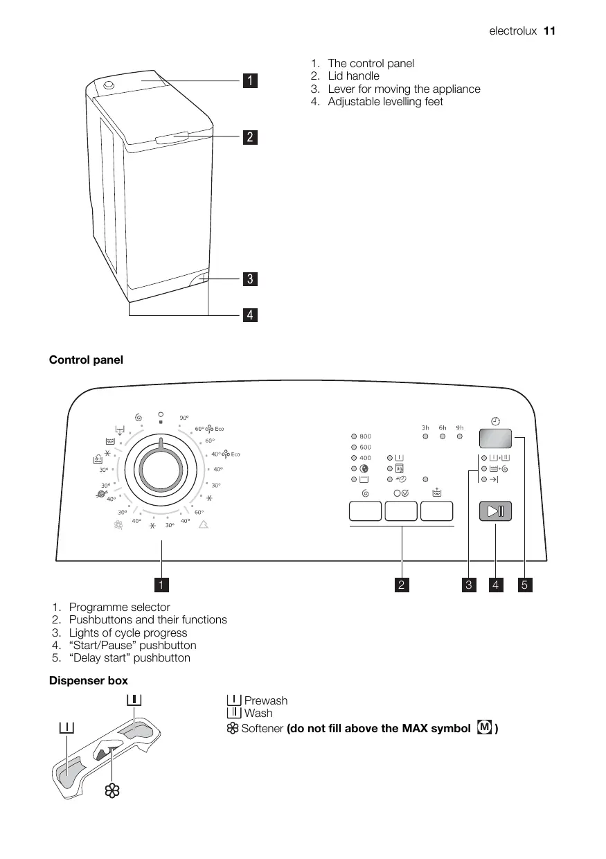 Programme selector Pushbuttons and their functions Lights of cycle progress “Start/Pause” pushbutton “Delay start” pushbutton