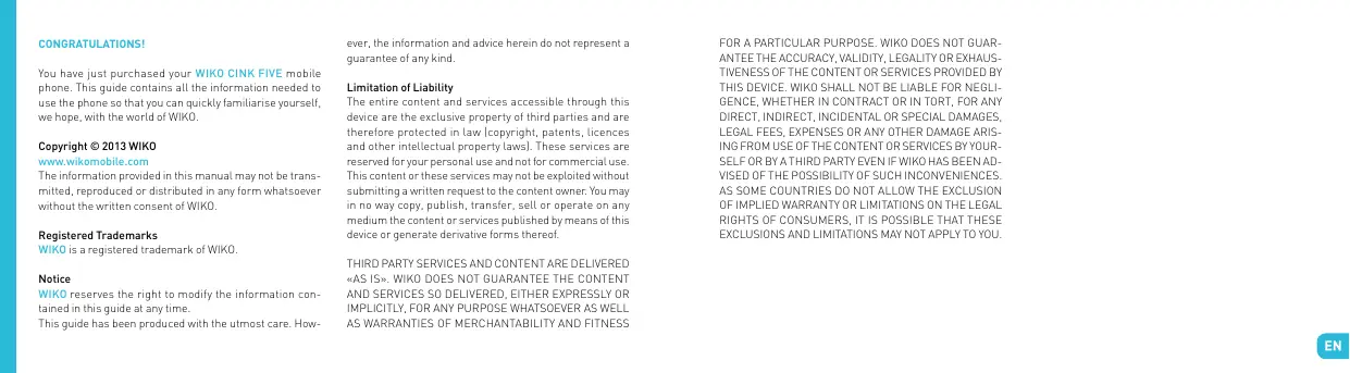 You have just purchased your WIKO CINK FIVE mobile phone. This guide contains all the information needed to use the phone so that you can quickly familiarise yourself, we hope, with the world of WIKO.
