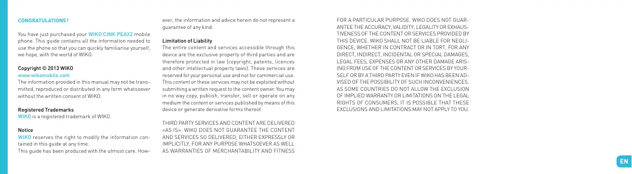 The contents of this manual may differ in certain respects from the description of your phone depending on its software version and your telephone operator. Congratulations ! You have just purchased your WIKO CINK PEAX2 mobile phone. This guide contains all the information needed to use the phone so that you can quickly familiarise yourself, we hope, with the world of WIKO. Copyright © 2013 WIKO www.wikomobile.com The information provided in this manual may not be transmitted, reproduced or distributed in any form whatsoever without the written consent of WIKO. Registered Trademarks WIKO is a registered trademark of WIKO. Notice WIKO reserves the right to modify the information contained in this guide at any time. This guide has been produced with the utmost care. How- ever, the information and advice herein do not represent a guarantee of any kind. Limitation of Liability The entire content and services accessible through this device are the exclusive property of third parties and are therefore protected in law (copyright, patents, licences and other intellectual property laws). These services are reserved for your personal use and not for commercial use. This content or these services may not be exploited without submitting a written request to the content owner. You may in no way copy, publish, transfer, sell or operate on any medium the content or services published by means of this device or generate derivative forms thereof. THIRD PARTY SERVICES AND CONTENT ARE DELIVERED «AS IS». WIKO DOES NOT GUARANTEE THE CONTENT AND SERVICES SO DELIVERED, EITHER EXPRESSLY OR IMPLICITLY, FOR ANY PURPOSE WHATSOEVER AS WELL