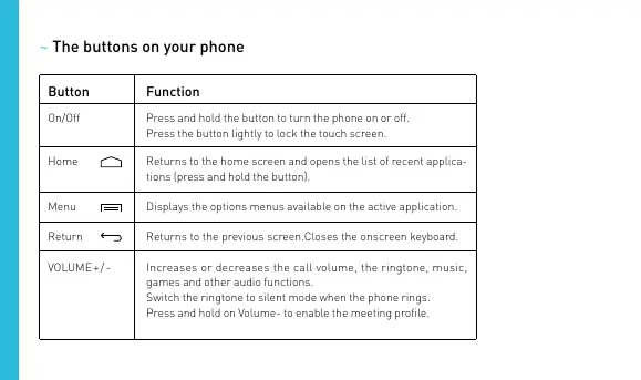Getting to Know Your Phone Earpiece 3,5 mm headphone jack Front camera Micro USB port Camera lens LED flash Volume +/On-Off/Lock Touch screen Home Menu Return Loudspeaker ~ The buttons on your phone Button Function On/Off Press and hold the button to turn the phone on or off. Press the button lightly to lock the touch screen. Home Returns to the home screen and opens the list of recent applications (press and hold the button). Menu Displays the options menus available on the active application. Return Returns to the previous screen.Closes the onscreen keyboard. VOLUME + / - Increases or decreases the call volume, the ringtone, music, games and other audio functions. Switch the ringtone to silent mode when the phone rings. Press and hold on Volume- to enable the meeting profile. Getting Started ~ Inserting SIM cards You will need to insert your SIM card before you can use your phone. There is a small notch on the side of the phone to open the back cover. Insert the SIM card following the diagram.