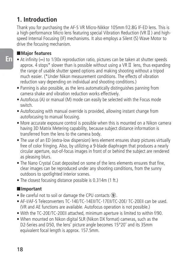 Touching the internal parts of the camera or lens could result in injury. Repairs should be performed only by qualified technicians. Should the camera or lens break open as the result of a fall or other accident, take the product to a Nikon-authorized service representative for inspection after unplugging the product and/or removing the battery. Turn off immediately in the event of malfunction • At infinity (∞) to 1/30x reproduction ratio, pictures can be taken at shutter speeds approx. 4 stops* slower than is possible without using a VR2 lens, thus expanding the range of usable shutter speed options and making shooting without a tripod much easier. (*Under Nikon measurement conditions. The effects of vibration reduction vary depending on individual and shooting conditions.) • Panning is also possible, as the lens automatically distinguishes panning from camera shake and vibration reduction works effectively. En