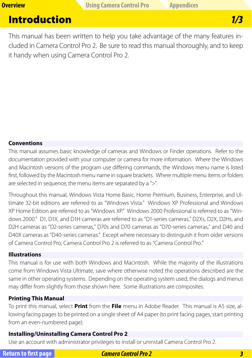 Using Camera Control Pro Appendices This manual has been written to help you take advantage of the many features in- cluded in Camera Control Pro 2. Be sure to read this manual thoroughly, and to keep it handy when using Camera Control Pro 2. Conventions This manual assumes basic knowledge of cameras and Windows or Finder operations. Refer to the documentation provided with your computer or camera for more information. Where the Windows and Macintosh versions of the program use differing commands, the Windows menu name is listed first, followed by the Macintosh menu name in square brackets. Where multiple menu items or folders are selected in sequence, the menu items are separated by a ">" Throughout this manual, Windows Vista Home Basic, Home Premium, Business, Enterprise, and Ul- timate 32-bit editions are referred to as “Windows Vista” Windows XP Professional and Windows XP Home Edition are referred to as “Windows XP” Windows 2000 Professional is referred to as “Win- dows 2000 D1, DIX, and DIH cameras are referred to as “DI-series cameras," D2Xs, D2X, D2Hs, and D2H cameras as “D2-series cameras,” D70s and D70 cameras as *D70-series cameras," and D40 and D40X cameras as "D40-series cameras.” Except where necessary to distinguish it from older versions of Camera Control Pro, Camera Control Pro 2 is referred to as “Camera Control Pro." Illustrations This manual is for use with both Windows and Macintosh. While the majority of the illustrations come from Windows Vista Ultimate, save where otherwise noted the operations described are the same in other operating systems. Depending on the operating system used, the dialogs and menus may differ from slightly from those shown here. Some illustrations are composites. Printing This Manual To print this manual, select Print from the File menu in Adobe Reader. This manual is A5 size, al- lowing facing pages to be printed on a single sheet of A4 paper (to print facing pages, start printing from an even-numbered page). Installing/Uninstalling Camera Control Pro 2 Use an account with administrator privileges to install or uninstall Camera Control Pro 2. Return to first page
