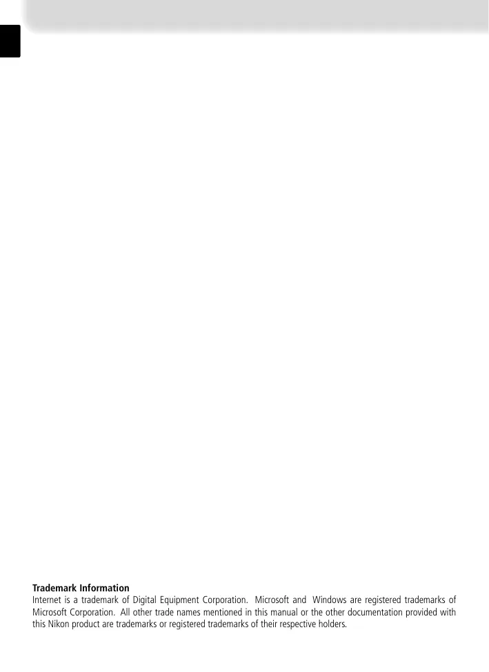 Internet is a trademark of Digital Equipment Corporation. Microsoft and Windows are registered trademarks of Microsoft Corporation. All other trade names mentioned in this manual or the other documentation provided with this Nikon product are trademarks or registered trademarks of their respective holders.