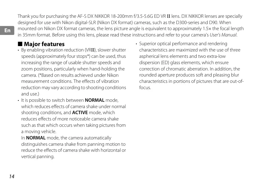 Thank you for purchasing the AF-S DX NIKKOR 18-200mm f/3.5-5.6G ED VR II lens. DX NIKKOR lenses are specially designed for use with Nikon digital-SLR (Nikon DX format) cameras, such as the D300-series and D90. When mounted on Nikon DX format cameras, the lens picture angle is equivalent to approximately 1.5× the focal length in 35mm format. Before using this lens, please read these instructions and refer to your camera’s User’s Manual. ■ Major features