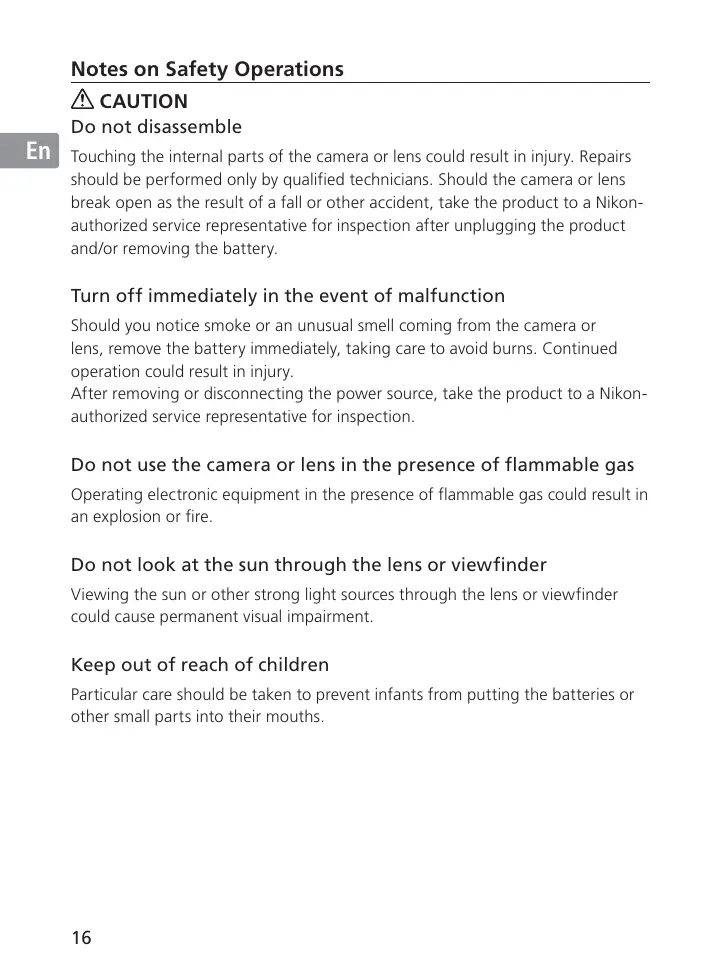 Touching the internal parts of the camera or lens could result in injury. Repairs should be performed only by qualified technicians. Should the camera or lens break open as the result of a fall or other accident, take the product to a Nikonauthorized service representative for inspection after unplugging the product and/or removing the battery.