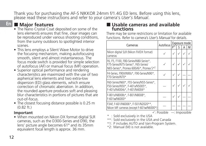 Thank you for purchasing the AF-S NIKKOR 24mm f/1.4G ED lens. Before using this lens, please read these instructions and refer to your camera's User's Manual.