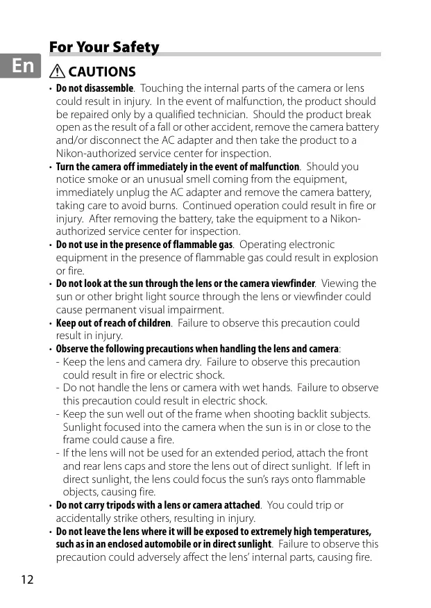 • Do not disassemble. Touching the internal parts of the camera or lens could result in injury. In the event of malfunction, the product should be repaired only by a qualified technician. Should the product break open as the result of a fall or other accident, remove the camera battery and/or disconnect the AC adapter and then take the product to a Nikon-authorized service center for inspection. • Turn the camera off immediately in the event of malfunction. Should you notice smoke or an unusual smell coming from the equipment, immediately unplug the AC adapter and remove the camera battery, taking care to avoid burns. Continued operation could result in fire or injury. After removing the battery, take the equipment to a Nikonauthorized service center for inspection. • Do not use in the presence of flammable gas. Operating electronic equipment in the presence of flammable gas could result in explosion or fire. • Do not look at the sun through the lens or the camera viewfinder. Viewing the sun or other bright light source through the lens or viewfinder could cause permanent visual impairment. • Keep out of reach of children. Failure to observe this precaution could result in injury. • Observe the following precautions when handling the lens and camera: - Keep the lens and camera dry. Failure to observe this precaution could result in fire or electric shock. - Do not handle the lens or camera with wet hands. Failure to observe this precaution could result in electric shock. - Keep the sun well out of the frame when shooting backlit subjects. Sunlight focused into the camera when the sun is in or close to the frame could cause a fire. - If the lens will not be used for an extended period, attach the front and rear lens caps and store the lens out of direct sunlight. If left in direct sunlight, the lens could focus the sun’s rays onto flammable objects, causing fire. • Do not carry tripods with a lens or camera attached. You could trip or accidentally strike others, resulting in injury. • Do not leave the lens where it will be exposed to extremely high temperatures, such as in an enclosed automobile or in direct sunlight. Failure to observe this precaution could adversely affect the lens’ internal parts, causing fire.