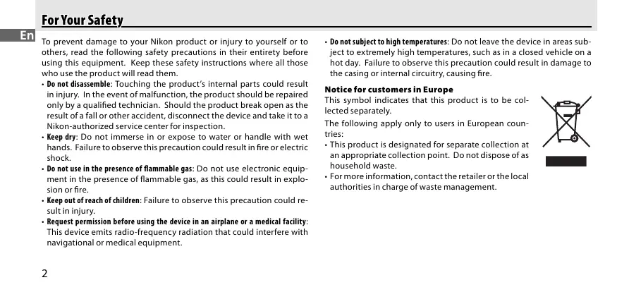 • Do not disassemble: Touching the product’s internal parts could result in injury. In the event of malfunction, the product should be repaired only by a qualified technician. Should the product break open as the result of a fall or other accident, disconnect the device and take it to a Nikon-authorized service center for inspection. En